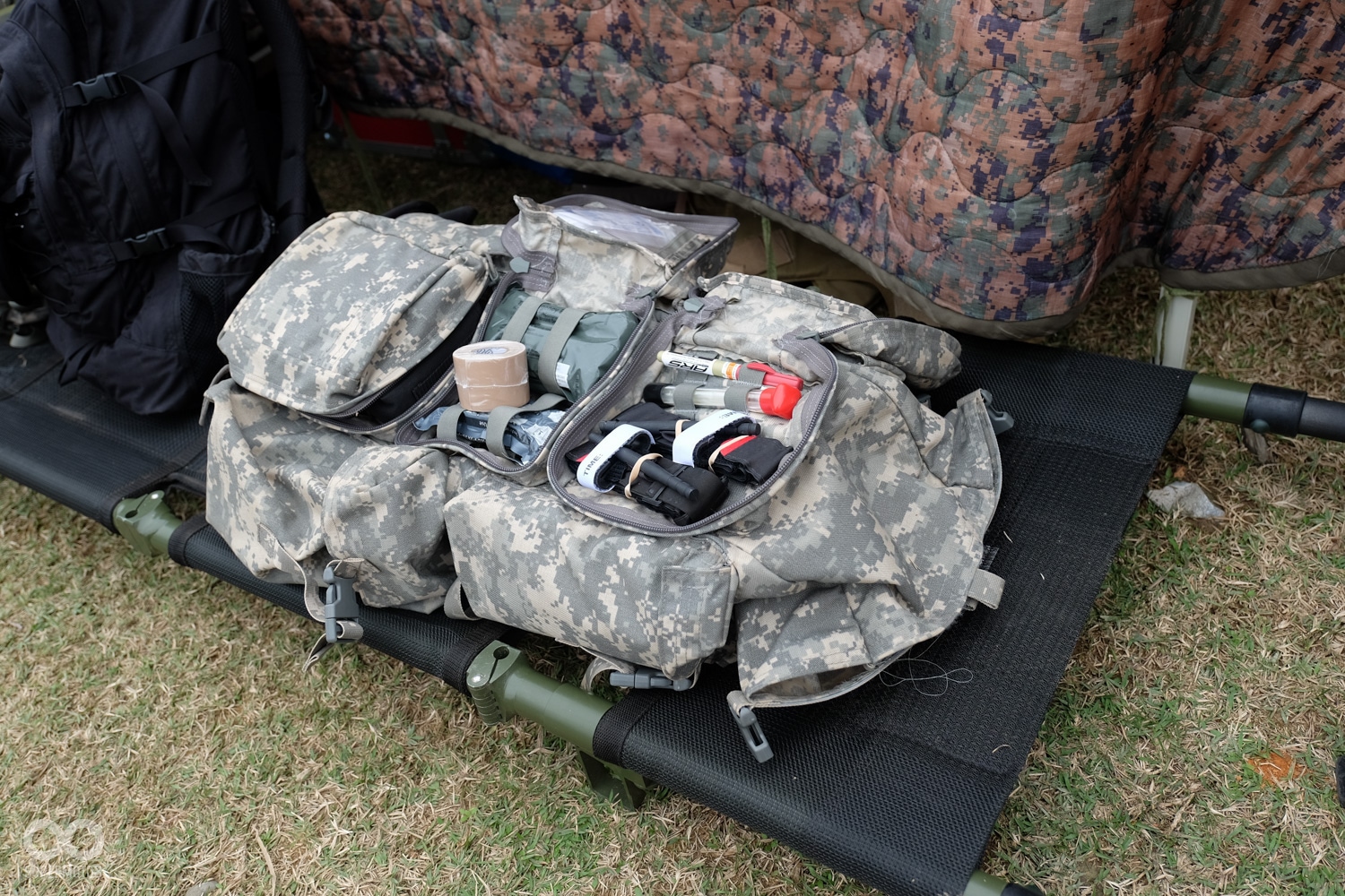 尋獲傷兵後,組員下車使用收折式的擔架迅速救出傷員,而車體2-1-1的座位配置也非常充裕的容納傷者與擔架空間,搭配上安全插銷固定,移動中也不擔心會有傷員墜落的問題發生。