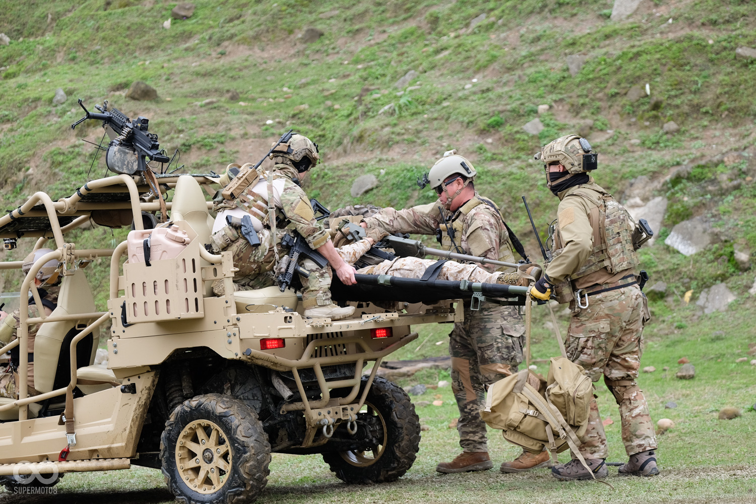在車體介紹結束後,主辦單位還特別請到了軍事專家為現場的來賓帶來精采的表演示範,內容主要分成搜救與突擊兩部分;在主持人一聲令下後組員迅速著手改變MRZR 4的配置,將原本2-2的四人座拆成三排,變成了2-1-1的配置,清出的空間以利放置架運送傷兵。