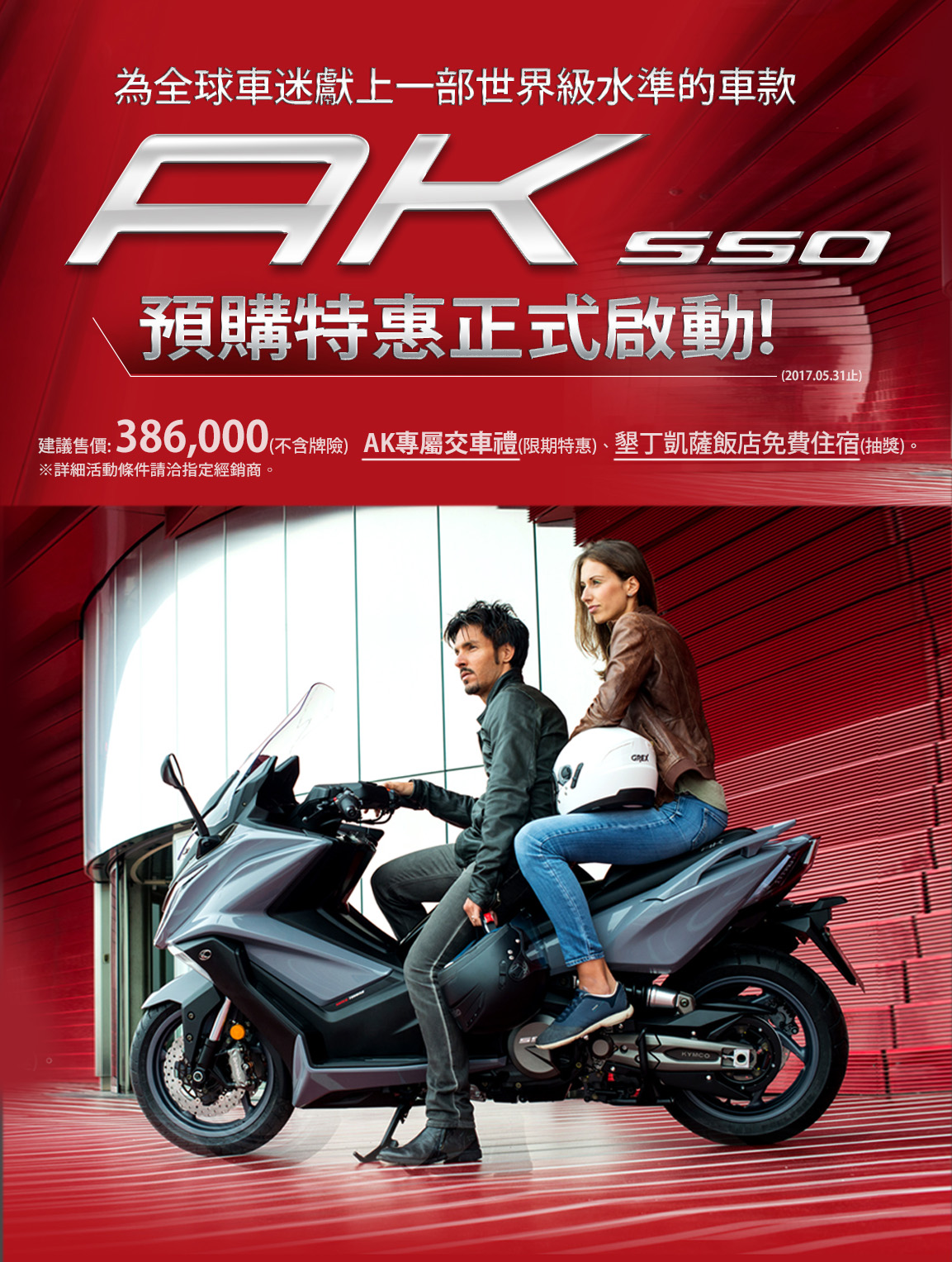象徵KYMCO品牌精神『Win My Heart』AK 550旗艦,開創『極致震撼跑旅Super Touring』級距先鋒,結合街跑車的高性能駕馭與跑旅車的舒適馳騁,讓性能與實用得 以兼得,為展現出嶄新風貌,AK 550全車每個細節均充分流露極致跑旅與高端設計的 完美結合,為Maxi Scooter大排氣量休旅車款樹立難以超越的標竿,集『創新與突 破』、『時尚與性能』、『豪華與實用』、『舒適與便利』於一體的全球戰略車款, KYMCO謹獻給追求最佳車款的全球車迷。