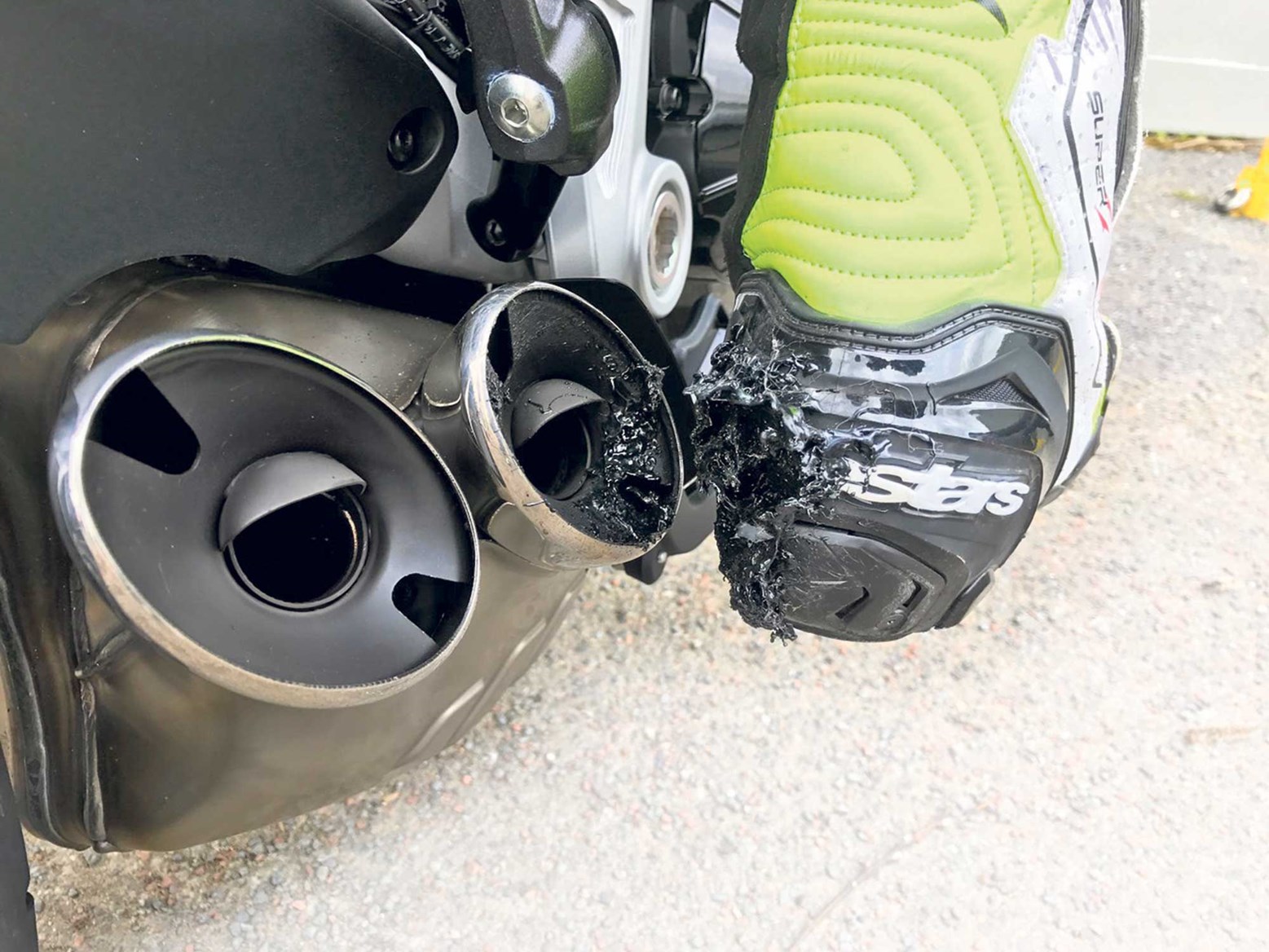 腳踏後移之後,騎士的右腳與尾管位置變得非常接近,尤其在激烈操駕時為創造出更多的傾角,騎士多會將彎內腳向後顛,進而導致右測腳跟直接與尾管接觸,造成車靴熔毀,嚴重甚至可能導致燒燙傷。