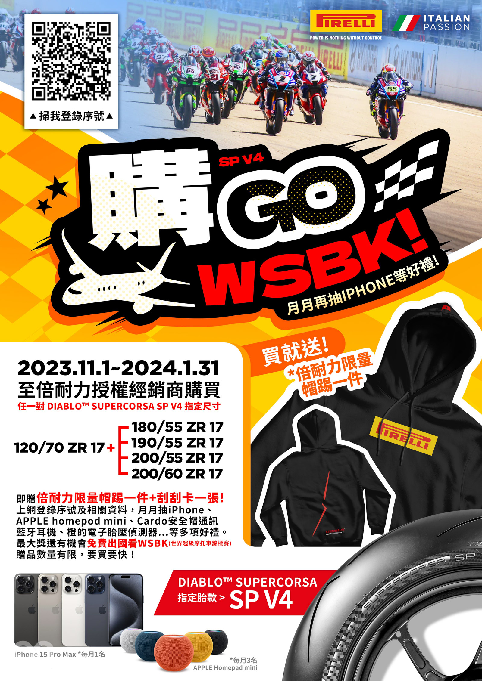 倍耐力DIABLO™ SUPERCORSA SP V4『購GO WSBK』活動自2023年11月1日起至2024年1月31日止。請大家不要錯過此難得機會,快到倍耐力各授權經銷據店購買DIABLO™ SUPERCORSA SP V4指定尺寸1套(共4個主流尺寸),每月抽出包含iPhone15、APPLE Homepad mini、Cardo藍牙耳機、橙的電子TPMS…等獎品,更有機會抽中最大獎 – 「2024 WSBK荷蘭站現場觀賽」的機會,距離活動結束已進入倒數計時階段,請大家快到倍耐力各授權經銷據點購換倍耐力全新技術與科技集於一體的第4代大閃DIABLO™ SUPERCORSA SP V4!