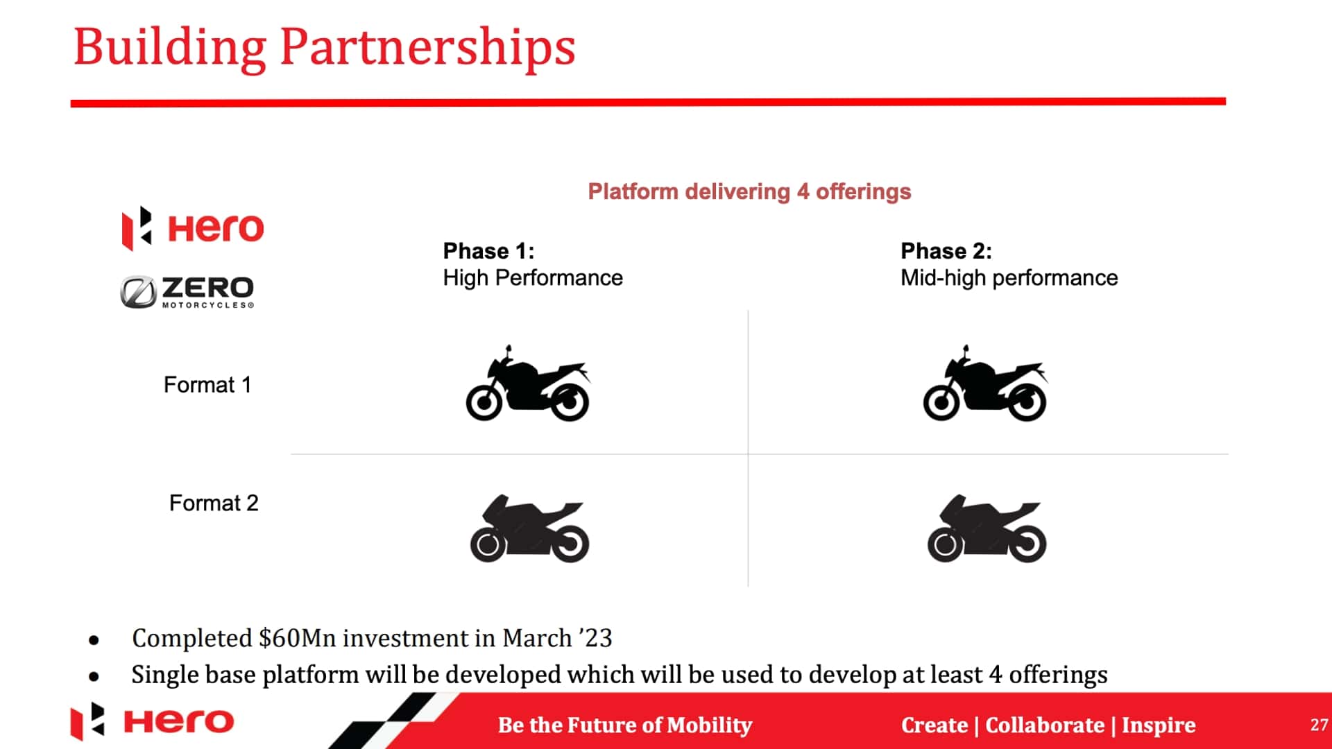 根據 Hero MotoCorp 在2024年1月23日的投資者互動報告,該平台將分為兩個階段,每個階段將推出兩款車型,涵蓋不同的性能和風格。第一階段將推出兩款高性能車型,一款是街車,一款是運動車,都將採用 Zero 的電動動力系統。第二階段將推出兩款中階車型,一款是迷你摩托車,一款是越野車,都將採用 Hero 和 Zero 共同開發的電動動力系統,並將調校為更適合初學者的性能。