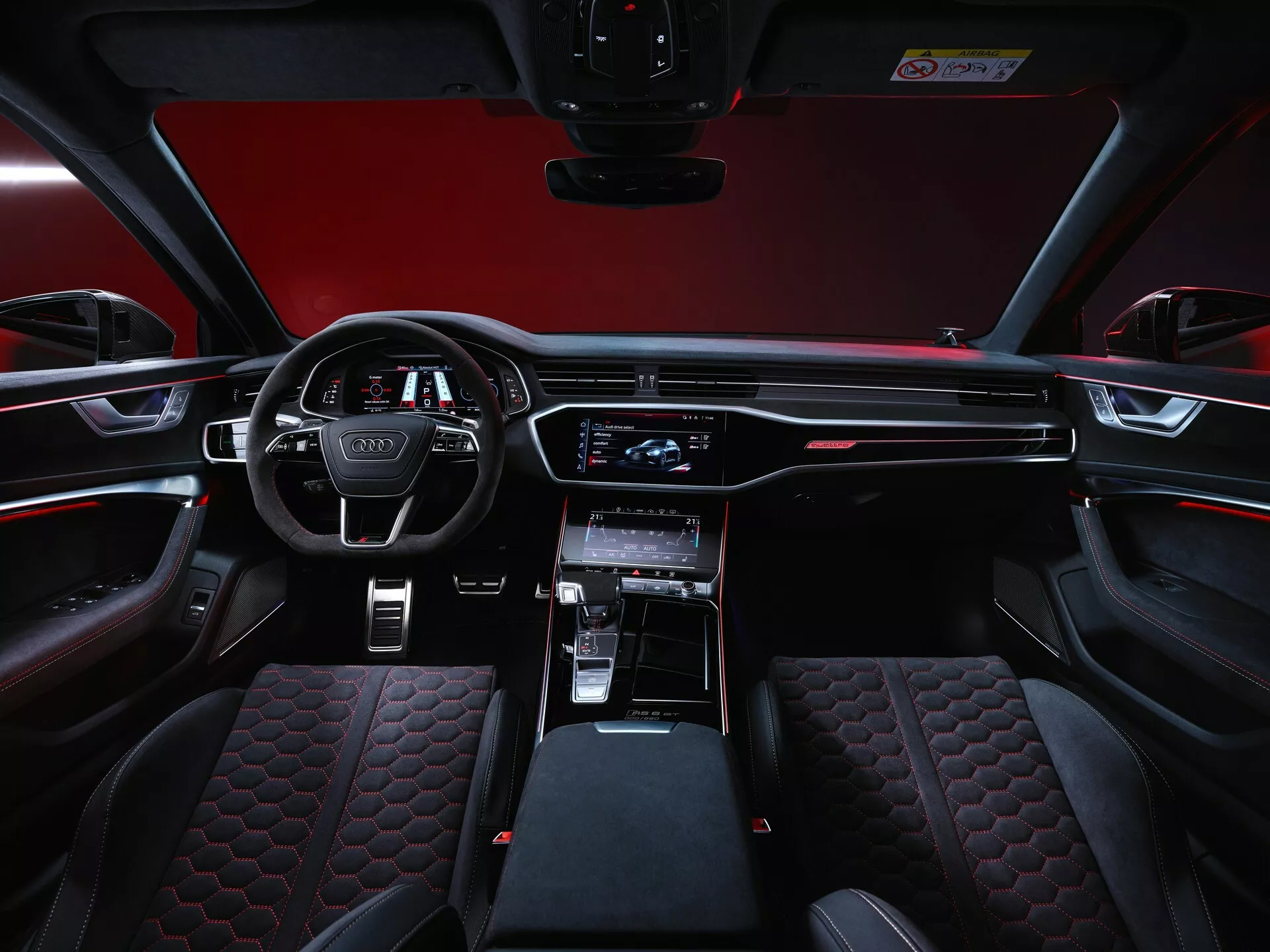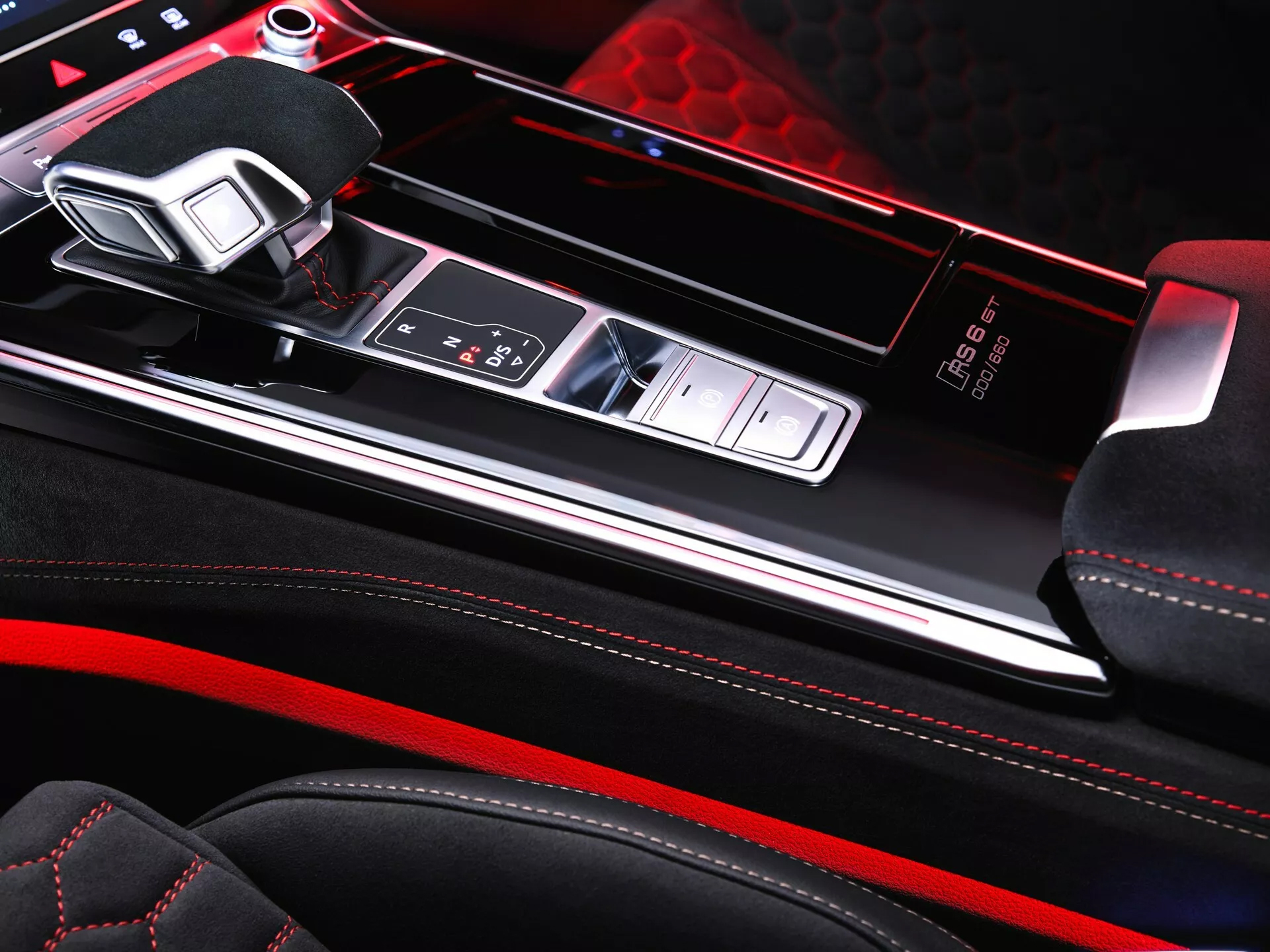 車內主要是更動材質和顏色,用黑色和紅色作為主要色調,並使用碳纖維飾板以及麂皮來包覆中控台、門板、座椅、扶手等處。雙前座戰鬥氣息超高的賽車座椅,頭枕處有「RS6 GT」字樣,椅面則使用蜂巢縫線帶來特氛圍,搭配紅色安全帶,絕對是熱血好爸爸們的最愛。中央扶手前方有限量編號銘牌,彰顯出RS6 Avant GT的獨有性。