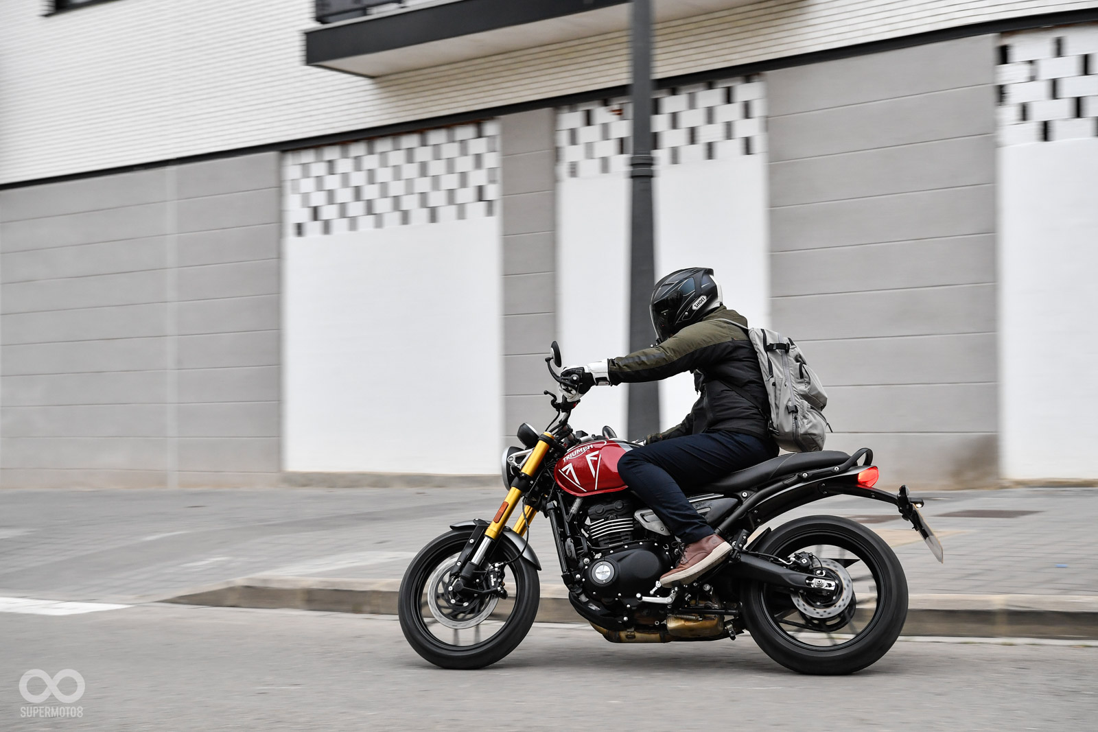 首先,兩款車型均搭載了Triumph全新開發的398cc單缸引擎,最大馬力達到40匹,最大扭力為37Nm。這樣的配置,在同級別中表現出色,在試乘會一開始,坐上車發動引擎後,雖然屁股下是一具看似平庸的單缸引擎,但在震動控制上做得非常好,更不用說從3,000轉就積極湧現的扭力值,實際騎乘時大約從4,000轉左右體感加速就相當亮眼。