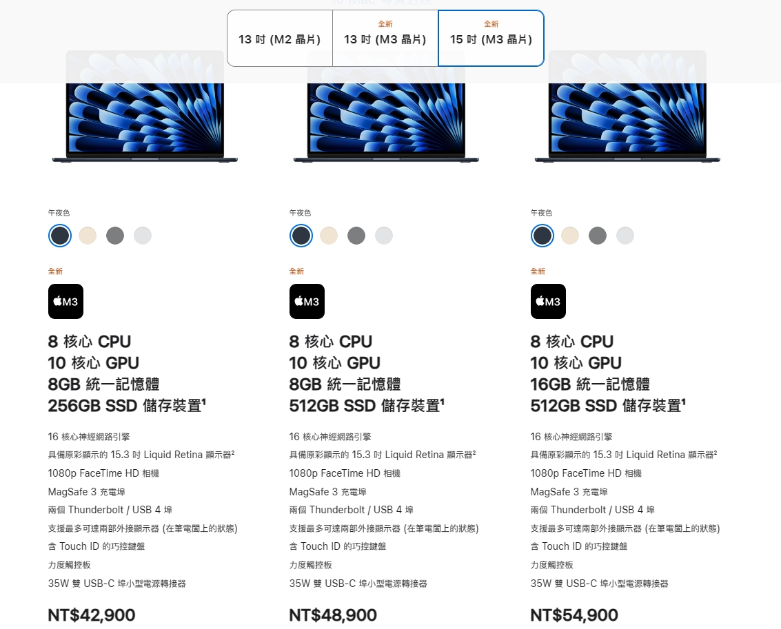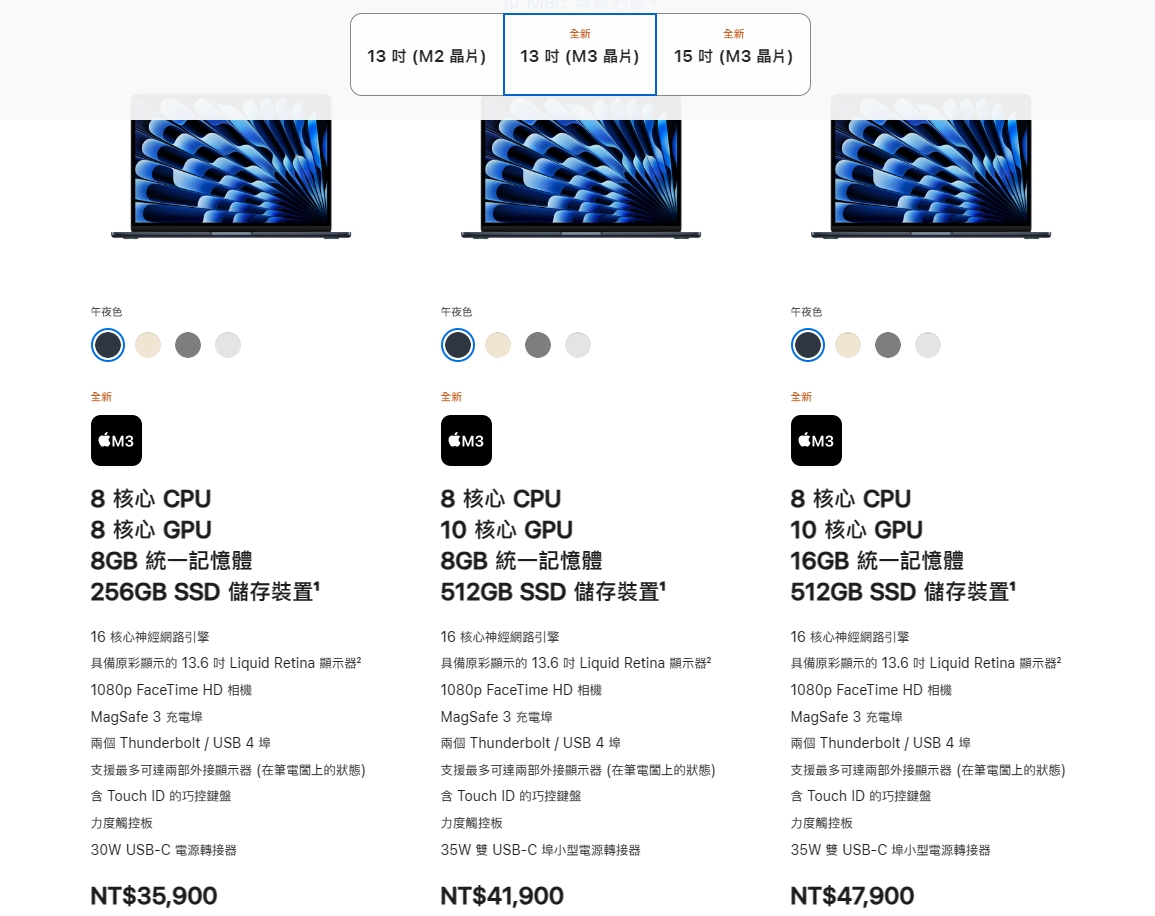 配備 M3 的 13 吋 MacBook Air 售價 NT$35,900 起;配備 M3 的 15 吋 MacBook Air 售價 NT$42,900 起,兩款機型均備有午夜色、星光色、銀色及太空灰色可供選擇;配備 M2 的 13 吋 MacBook Air,備有午夜色、星光色、銀色及太空灰色可供選擇,現在售價 NT$32,900 起。目前APPLE台灣的官方網站尚未開放訂購。