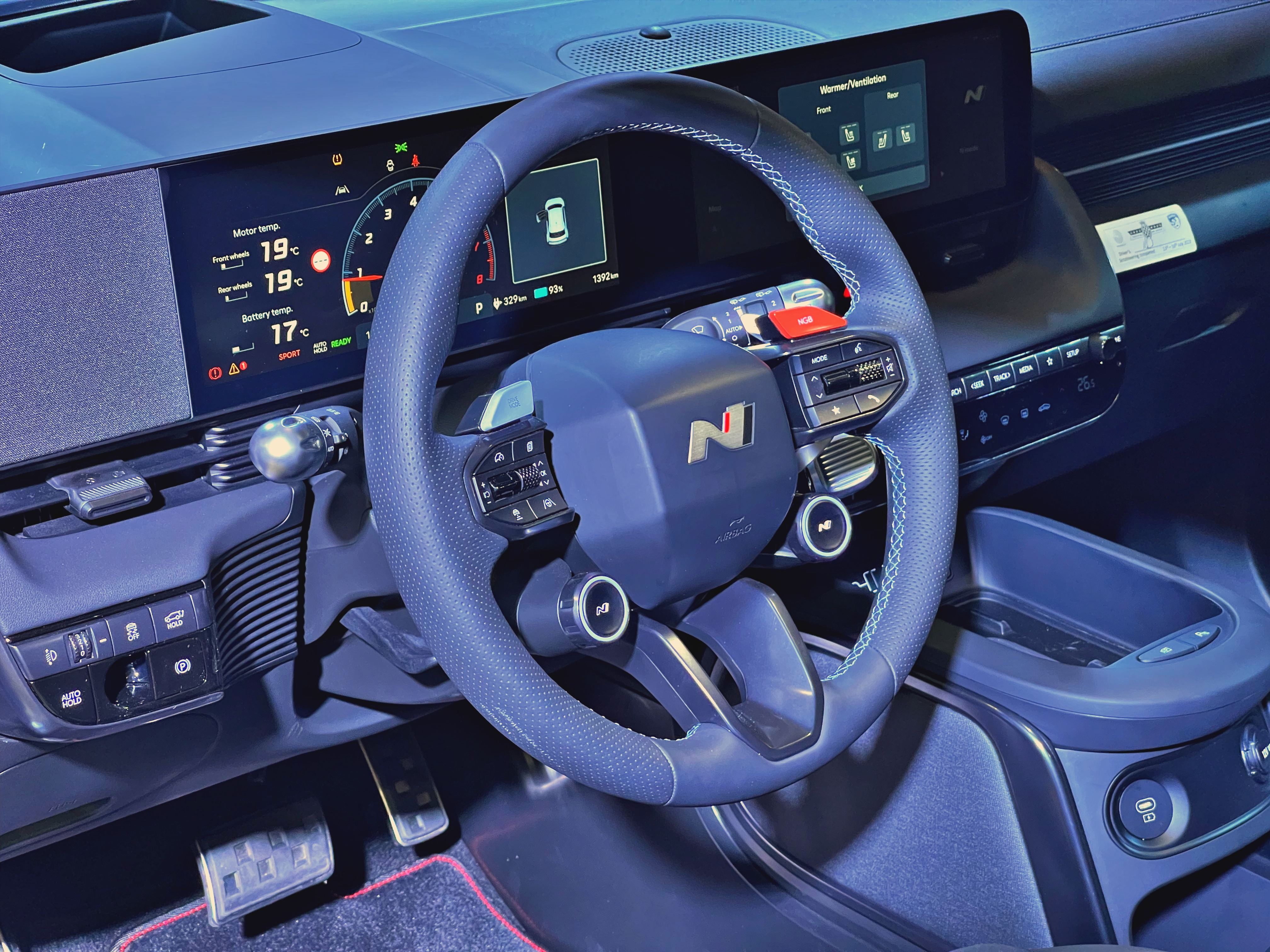 以駕駛者為中心的車艙第一視覺,Ioniq 5 N大幅強化內裝佈局,換上專屬N性能多功能方向盤,快速切換駕駛模式,亦能直接啟動N超增壓模式 (N Grin Boost) 與N換檔回饋 (N e-Shift) 。同時,設計風格與抓握感針對性能操控需要升級,配合N Performance品牌LOGO與對比色縫線點綴,視覺、觸感以及極限操作同步強化。車艙內採用黑色頂篷,配合對比色縫線與方格旗元素,凸顯Ioniq 5 N源自於賽道的冠軍DNA戰鬥氣息,甚至腳下方格旗小巧思的N專屬性能金屬踏板組,藉以細節營造性能視覺。