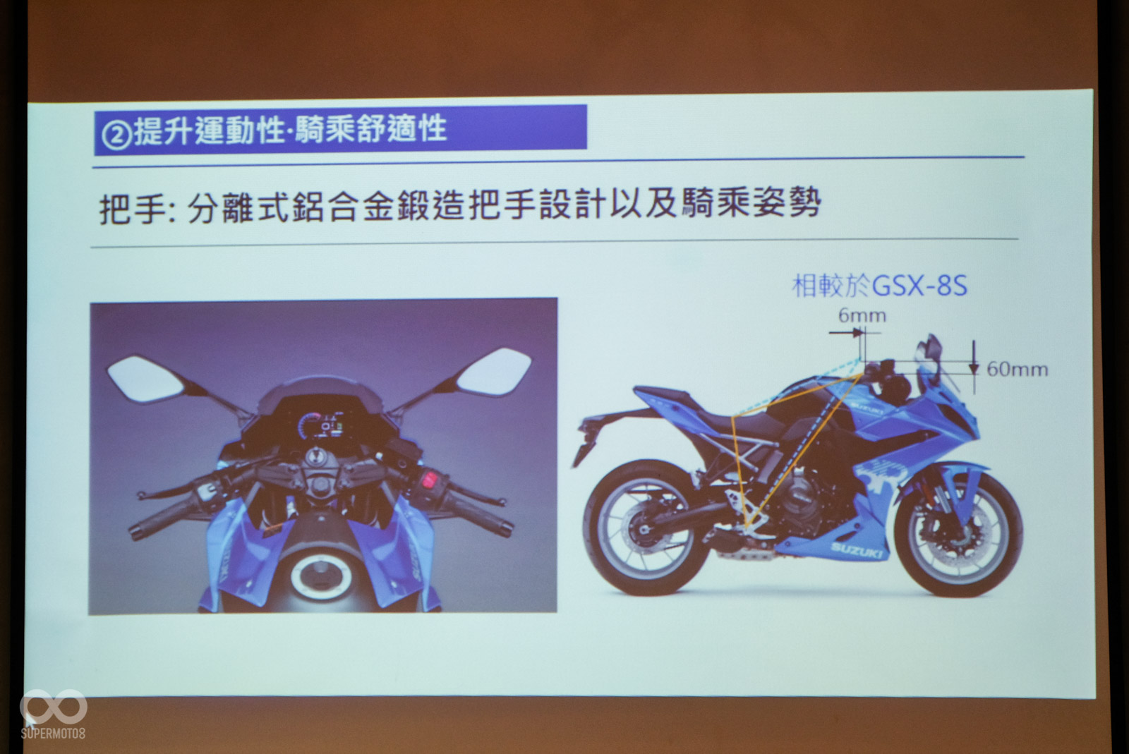 開頭要先打破大家對於GSX-8R的美好幻想,從米蘭車展第一手的跨坐時就知道,GSX-8R並非是走熱血派的騎乘三角設定,而是標準的街跑車定位,810mm的座高和GSX-8S一樣有不錯的雙腳貼地性,握把則是比8S更低一點,讓騎士可以更好地躲在整流罩、風鏡帶來的擋風區域內。