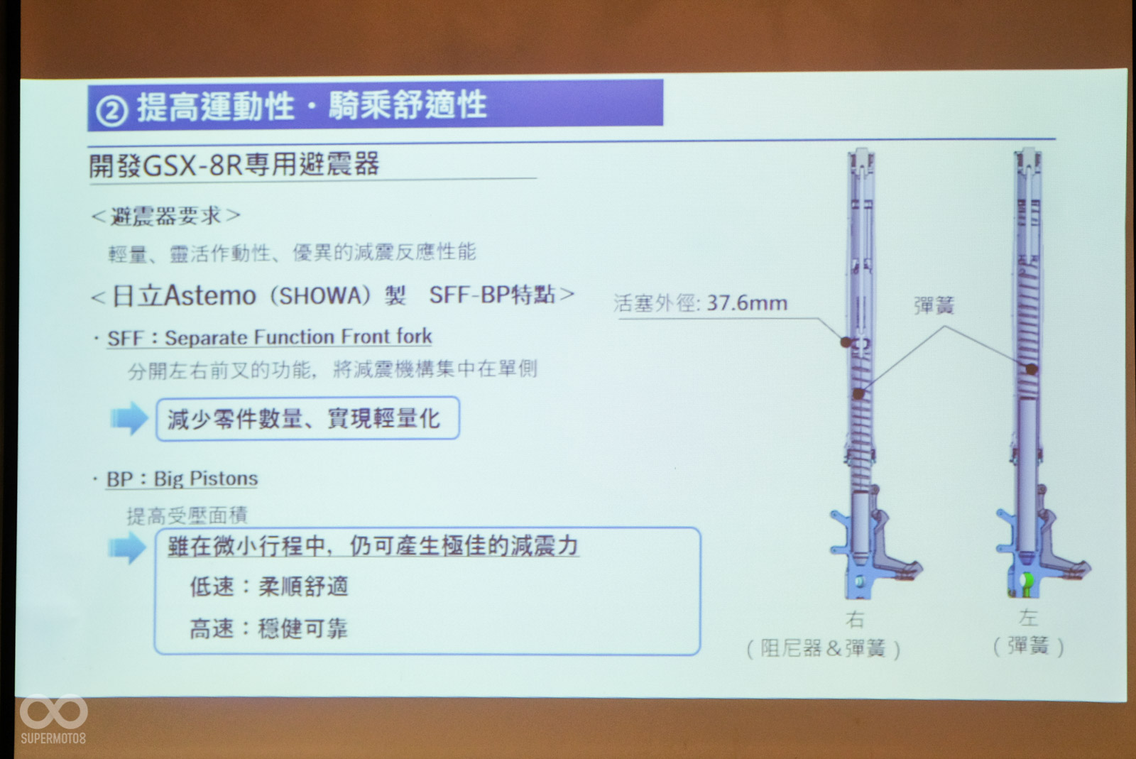 快節奏騎乘時,GSX-8R的動態表現仍然承襲了8S時期的輕快,特別是換分離把後讓騎士重心更向前靠攏,在高速把車丟入彎道中時,車輛的指向性、入彎的收線效率都比街車的8S更順暢;NISSIN的四活塞卡鉗提供的制動效果也十分出色,重煞車入彎時前懸吊的支撐性也能給予騎士十足的信心。