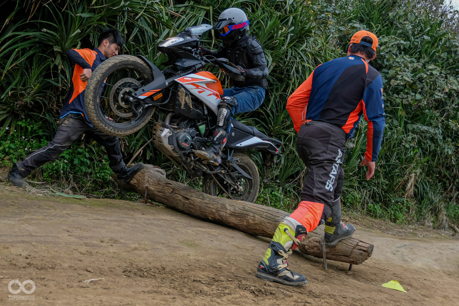 最後一項課程則是今天的大魔王,跨越30cm高的倒木!這個關卡需要使用到壓前叉、彈離合器孤輪的技巧,讓車頭稍微浮起後順利越過,對於騎士的心理是一大考驗,畢竟眼前有著障礙物卻要補油,實在有點違反常理,而小編在記錄的過程中也明顯感受到學員經過反覆的練習,越來越能抓準補油的時機點,順利為抬起前輪越過障礙。