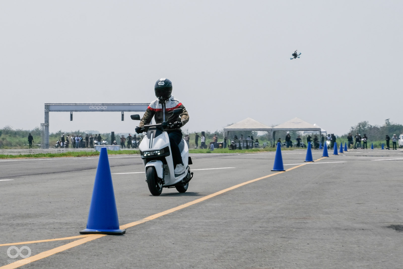 下一站的繞錐體驗中,雖然這次錐桶擺放間隔稍遠,整體繞錐節奏速度並不慢,但讓車輛在時速 50km/h 左右快速奔向錐桶,連續左右翻的狀態下 Gogoro Pulse 可是一點都不費力,有如切豆腐般的俐落動態,讓我想起當年 Gogoro 1 給人那種短軸距的活潑感受,不論是車輛重心設定,還是避震器的調教都可以感受到這次 Gogoro 想打造性能旗艦的決心。