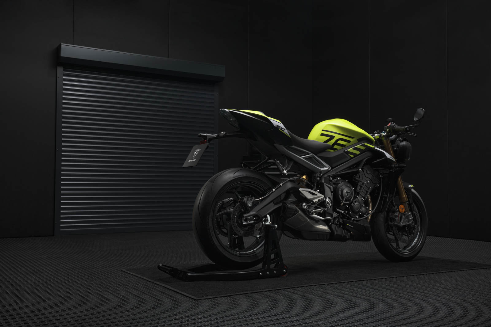 首先,最搶眼的莫過於那隻粗壯的後搖臂,明顯跟現行款Street Triple 765 Moto2™較為細長的海鷗式設計不同,更像是仿賽車款,甚至賽車使用的設定,這點在輪框、Pirelli SuperCorsa輪胎上也獲得印證;此外,車架上能看到不少像整流罩的鎖點孔位,車頭圓燈、儀表也是臨時拼湊組裝的產物。