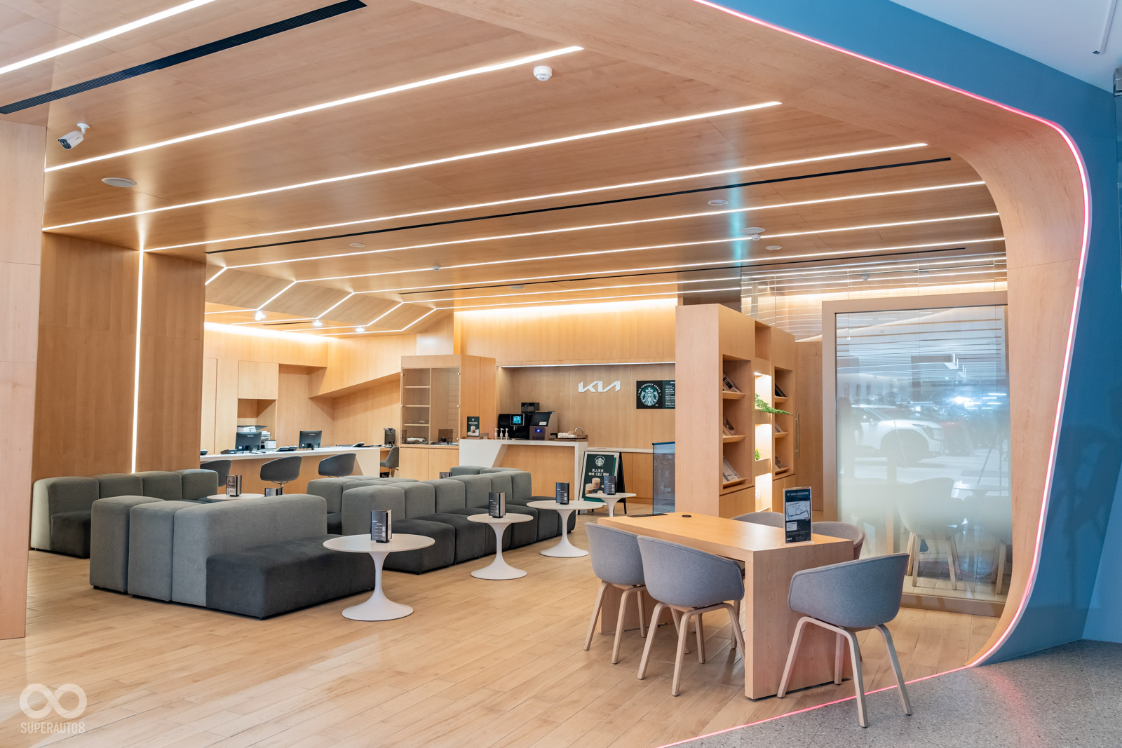 全新的桃園3S展示中心由內而外遵循「Kia Store」的設計概念,展示中心並設置深受消費者喜愛的Starbucks星巴克咖啡,提供顧客更優質尊榮的貼心服務體驗。同時,因應Kia新能源車之產品布局,亦同步於服務廠增設電動車專屬工位、設置充電樁,以滿足新能源車主的用車需求。此外,室內並以井字型燈光設計、溫暖的木質客休區等貼心規劃,提供車主更舒適愉悅的服務體驗。