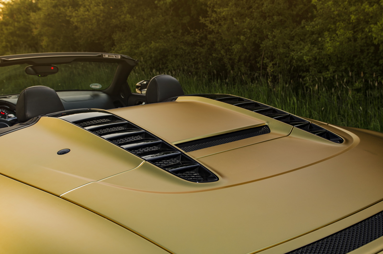 外觀噴塗了無光澤的消光金色,這是近年來最夯的車身顏色,除此之外,引擎蓋、車側進氣孔、車尾引擎飾板以及後保桿散熱蓋搭配黑色鋼琴烤漆來做對比色搭配,更突顯出車身消光金的特別。鋁圈維持原廠20吋規格,同樣用了亮光黑色烤漆,與車身部分鈑件顏色做了完美結合。
