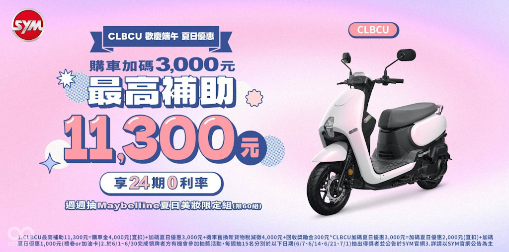 初夏六月、SYM Fiddle LT、CLBCU125限時優惠,再抽Maybelline夏日美妝限定組(限60組),敬請蒞臨全台SYM經銷商賞車。