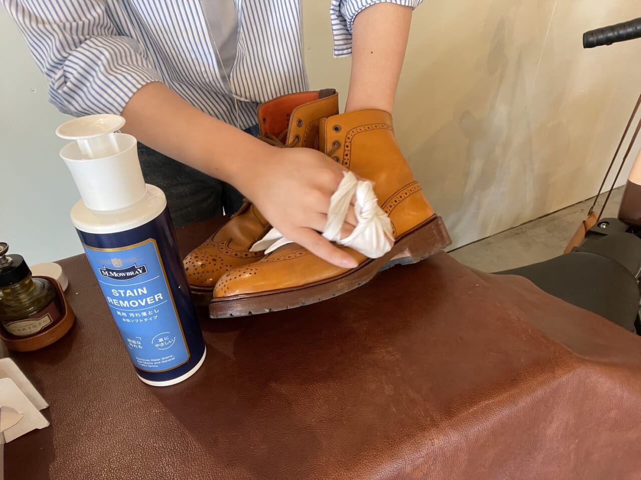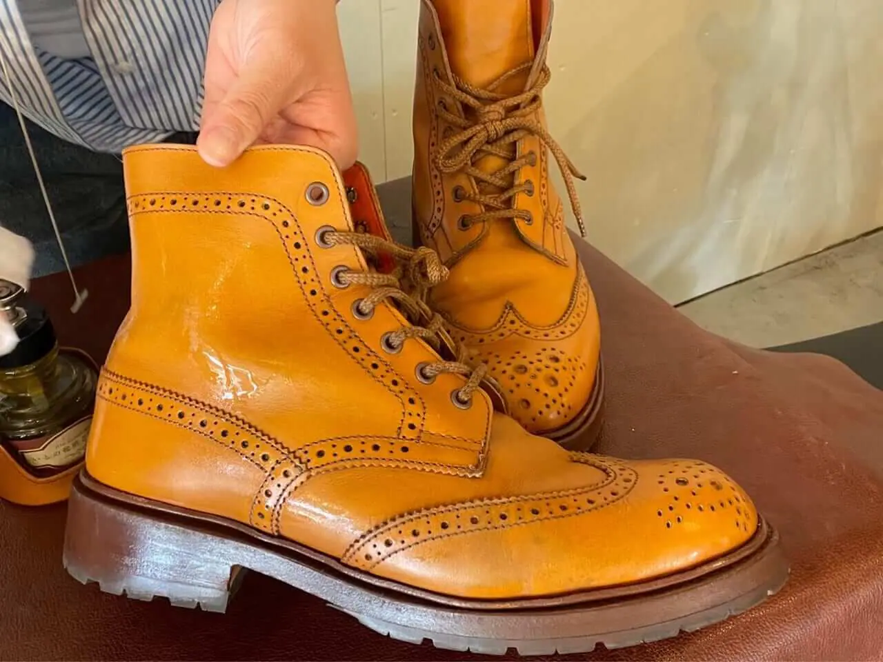 被雨水浸潤過的皮革會比平常乾燥,所以我們需要替皮革進行保濕,在靴子半乾到全乾的時候,使用鞋油進行保濕滋潤護理,就跟平常的擦鞋步驟一樣!