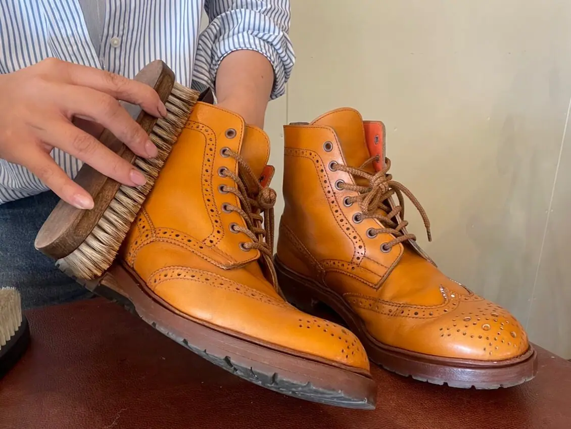 用猪毛刷子刷拭整個靴子。刷子可以幫助將鞋油的滋潤成分均勻地刷進皮革裡,讓皮革保持光澤柔軟。最後用乾淨的布擦拭掉多餘的鞋油,就大功告成啦!經過一番護理,靴子完全恢復了原本帥氣的模樣,而且皮質柔軟舒適,不會因為淋雨而變得僵硬!
