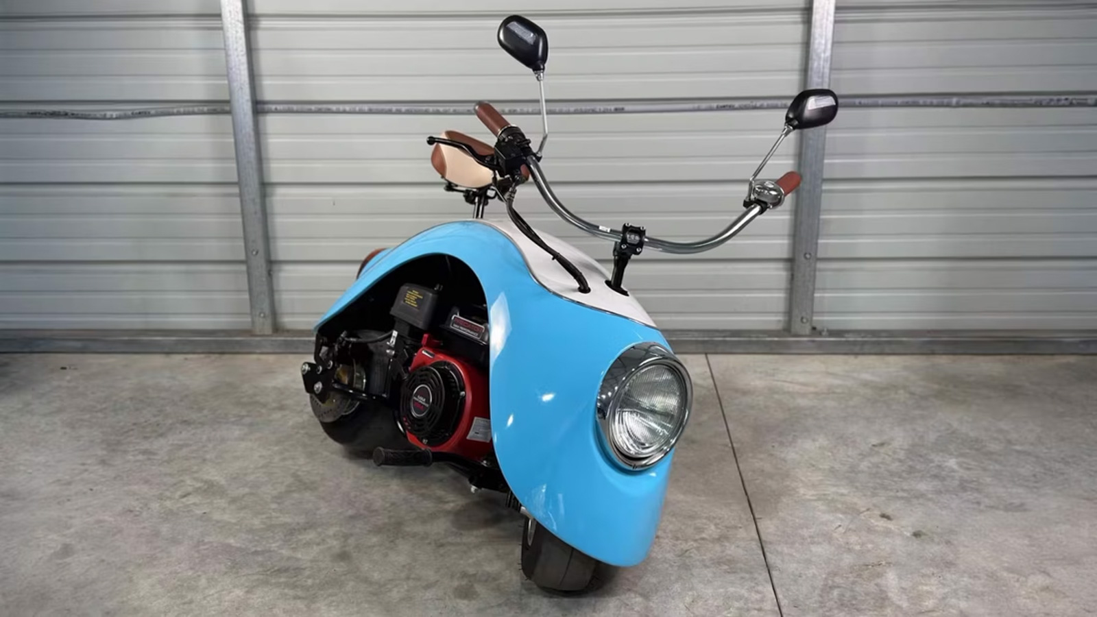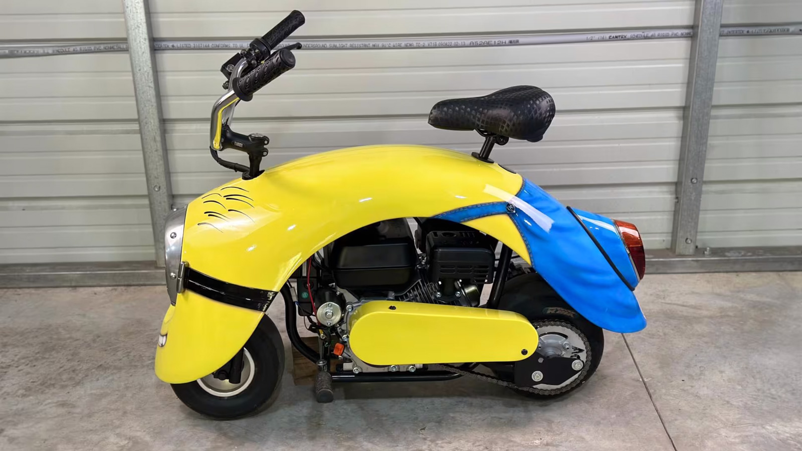 Fusconeta Custom Mini Bike 採用輕量化玻璃纖維製成,完美重現金龜車的經典圓潤外觀。車身前方搭載單缸四行程引擎,排氣量為 223 cc,可輸出約 6 匹馬力。動力透過鏈條傳遞至後輪,並配備碟煞系統,提供更安全的製動表現。