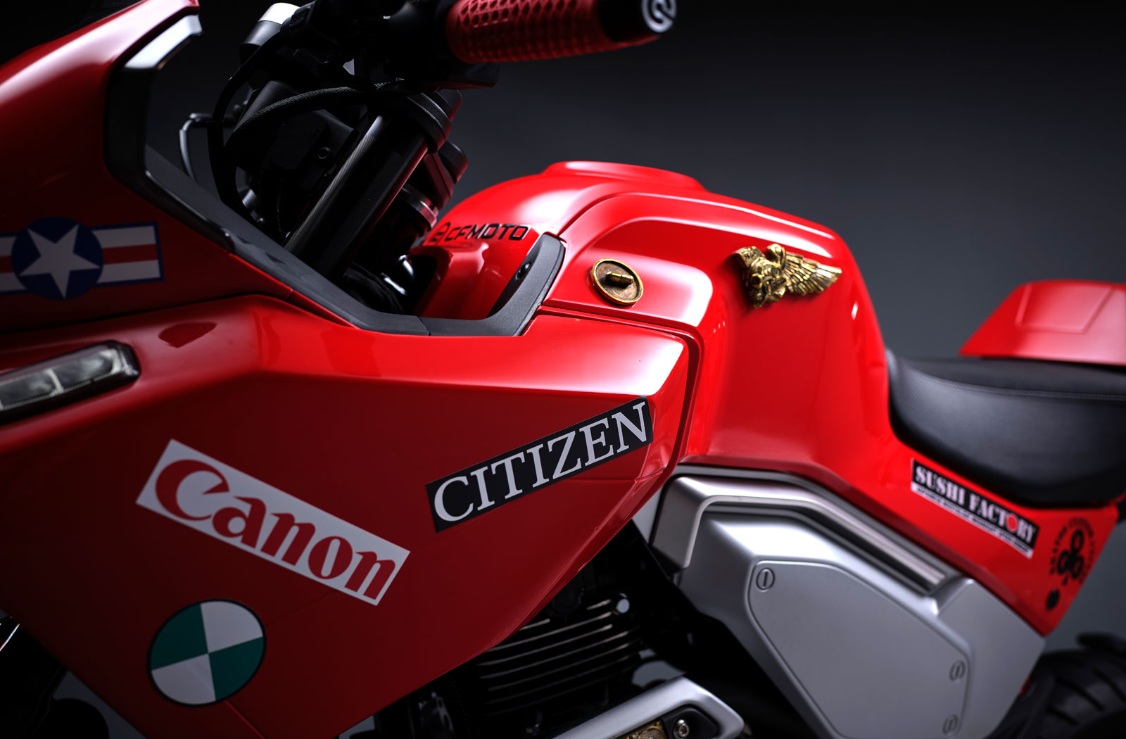這台 CFMoto Papio XO-1 Akira 整車以動畫電影中的主角金田的座駕為原型,採用手工訂製的車身鈑件、黃銅材質的鑰匙、鍊條和銘牌,整車採用紅色塗裝,搭配各種貼紙,既有 13 Lucky Monkey 品牌 Logo 也有趣味的元素,例如頭燈右側的“笑臉”圖案,復刻了電影中那輛充滿 80 年代賽車風格的摩托車。