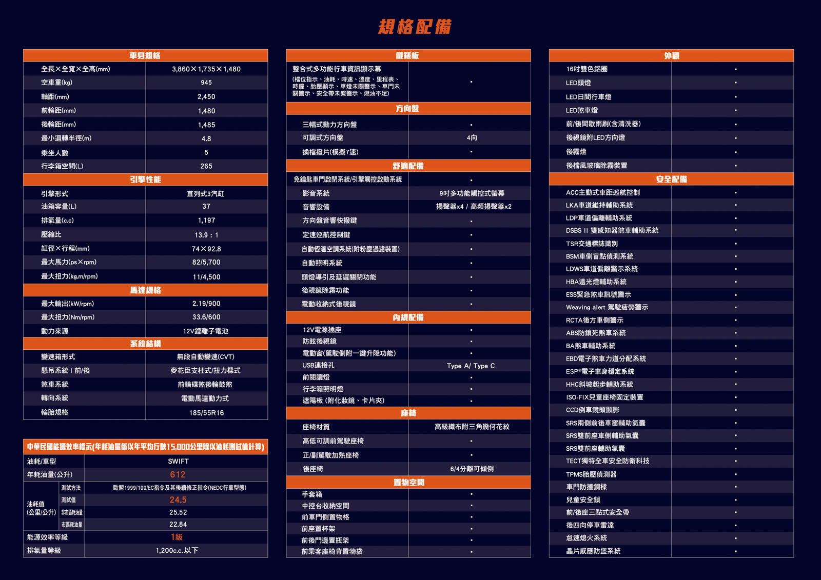 ALL NEW SWIFT搭載的引擎排氣量和前代同為1,197c.c.,具備牌照稅、燃料費優勢,採用全新引擎架構設計,輕量化本體及更高的壓縮比,搭配SHVS智能混合動力系統成就絕佳燃油效率,油耗達到24.5km/L,獲得經濟部能源署的一級能耗效率認證。ALL NEW SWIFT實現燃油效率與駕駛性能的雙重提升,為每段旅程提供輕快動能的體驗。