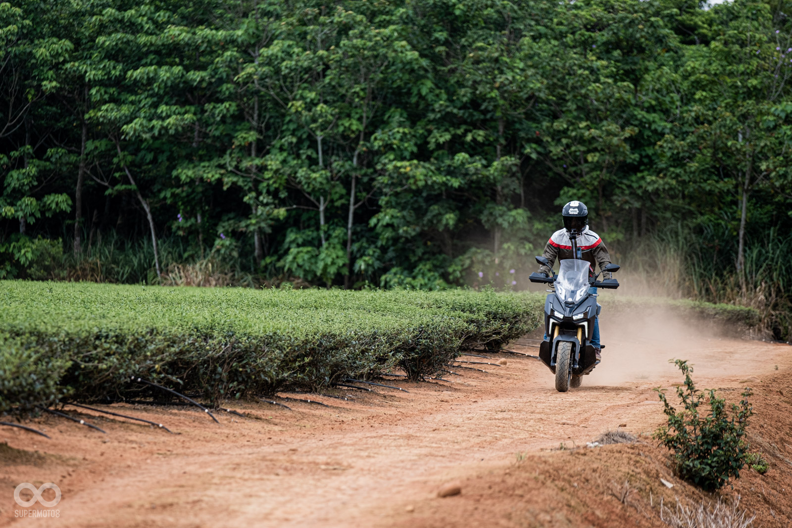這次SYM同樣安排在苗栗銅鑼茶廠進行ADXTG的試乘,但與發表時的簡易路線不同,這次SYM安排了較為深入的越野路況,包含有水泥鋪裝路面、碎石路、純土路等多種的路況,在前半段較為平整的水泥鋪裝路面上,ADXTG硬朗的懸吊吸震效果意外的出色,很明顯能感受到前41MM倒立式前叉,以及後多連桿單槍避震器完美的把來自路面的碎震吸收掉,直接傳導到握把、坐墊上的震動並沒有非常直接、明顯。