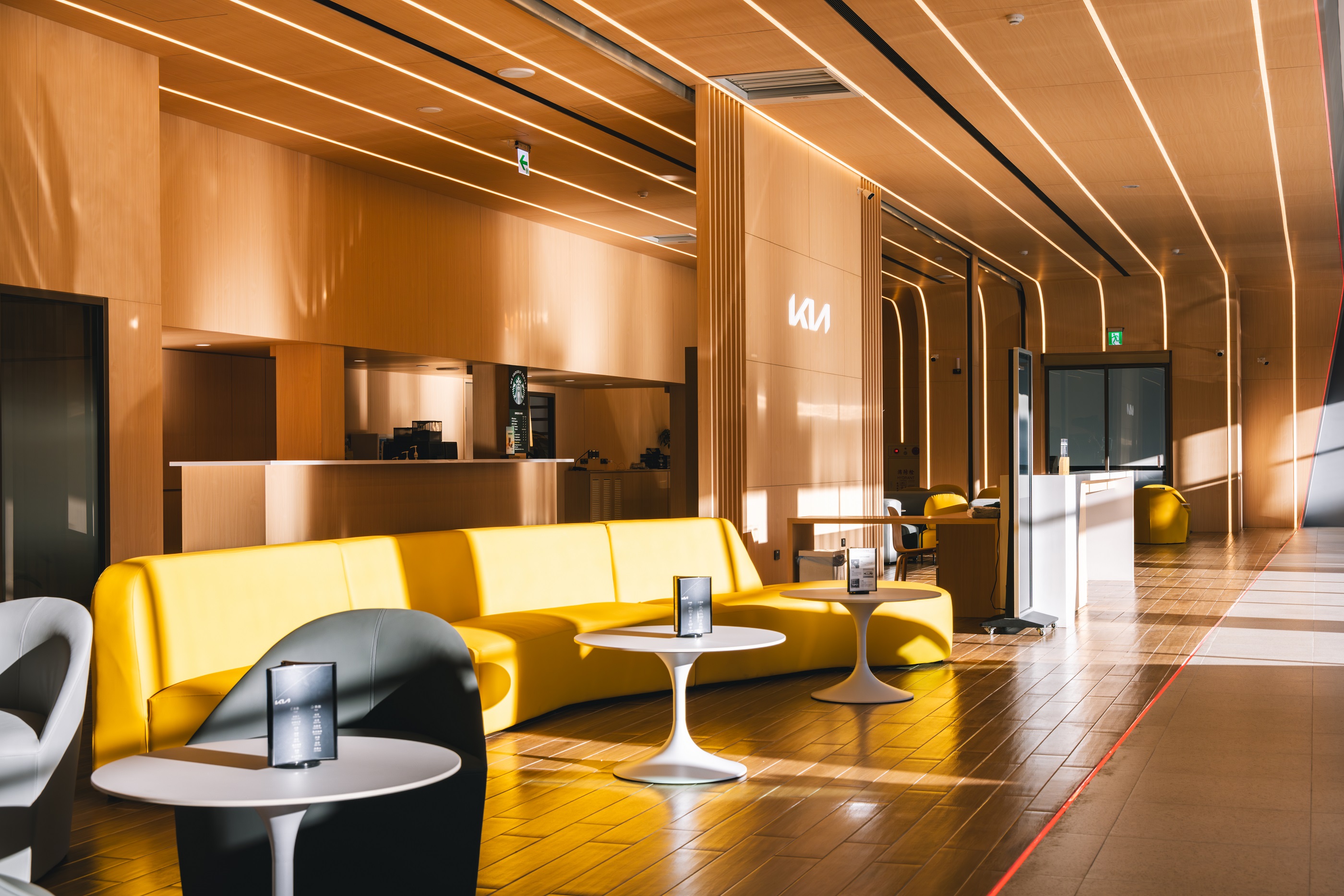 全面升級的Kia高雄民族展示中心以新CI 2.0品牌識別亮相,遵循「Kia Store」的設計概念,室內利用大量暖光木質飾板,打造貼近自然、無壓力的客休沙發區;展示區則透過灰色牆面搭配燈光設計的簡約設計,室內則分為兩個區塊,展示區呈現未來感與寧靜感,讓顧客能關注在產品上;客戶區利用井字型燈光設計,搭配大量木質建材交錯,打造貼近自然、無壓力感受,讓車主能更舒適愉悅的享受服務體驗。