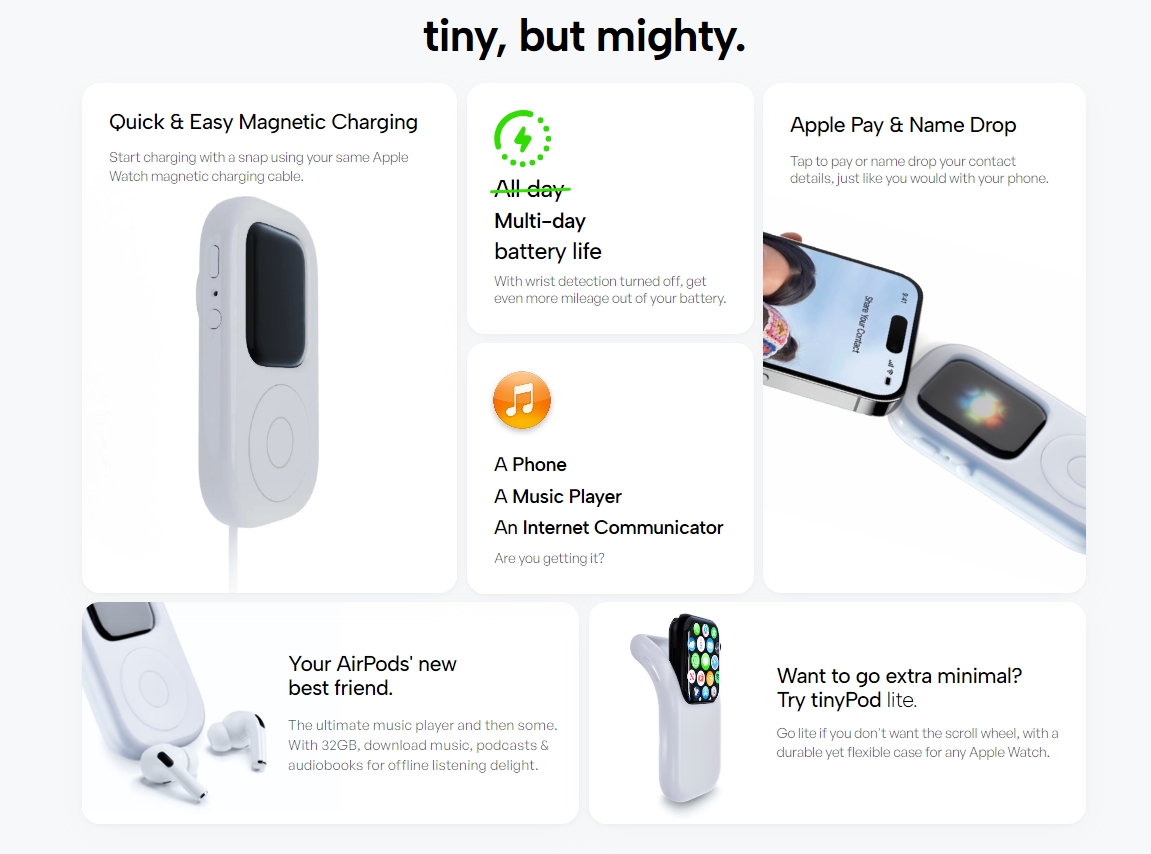 tinyPod 不只是造型復古,功能上也頗有巧思。產品標榜「遠離手機的手機 (Your phone away from phone)」的概念,搖身一變成為「次世代功能手機」。只要你的 Apple Watch 支援行動網絡,tinyPod 就會搖身一變,讓你遠離智慧手機的紛擾,享受單純的音樂與通話功能。