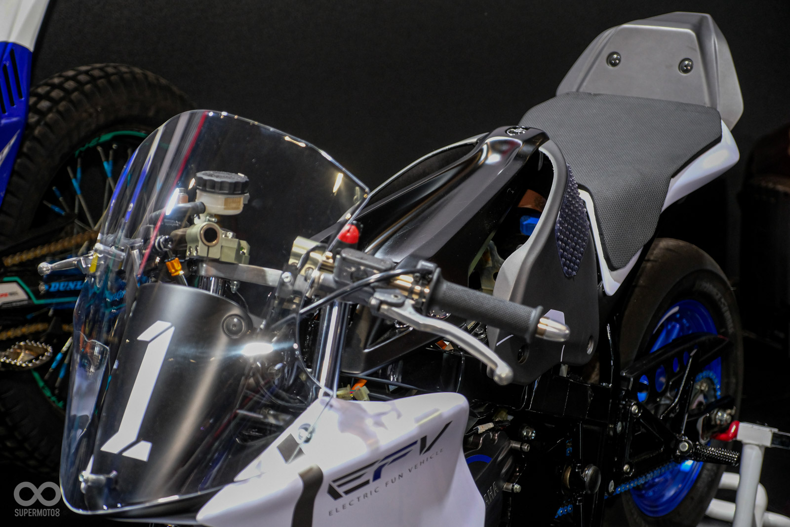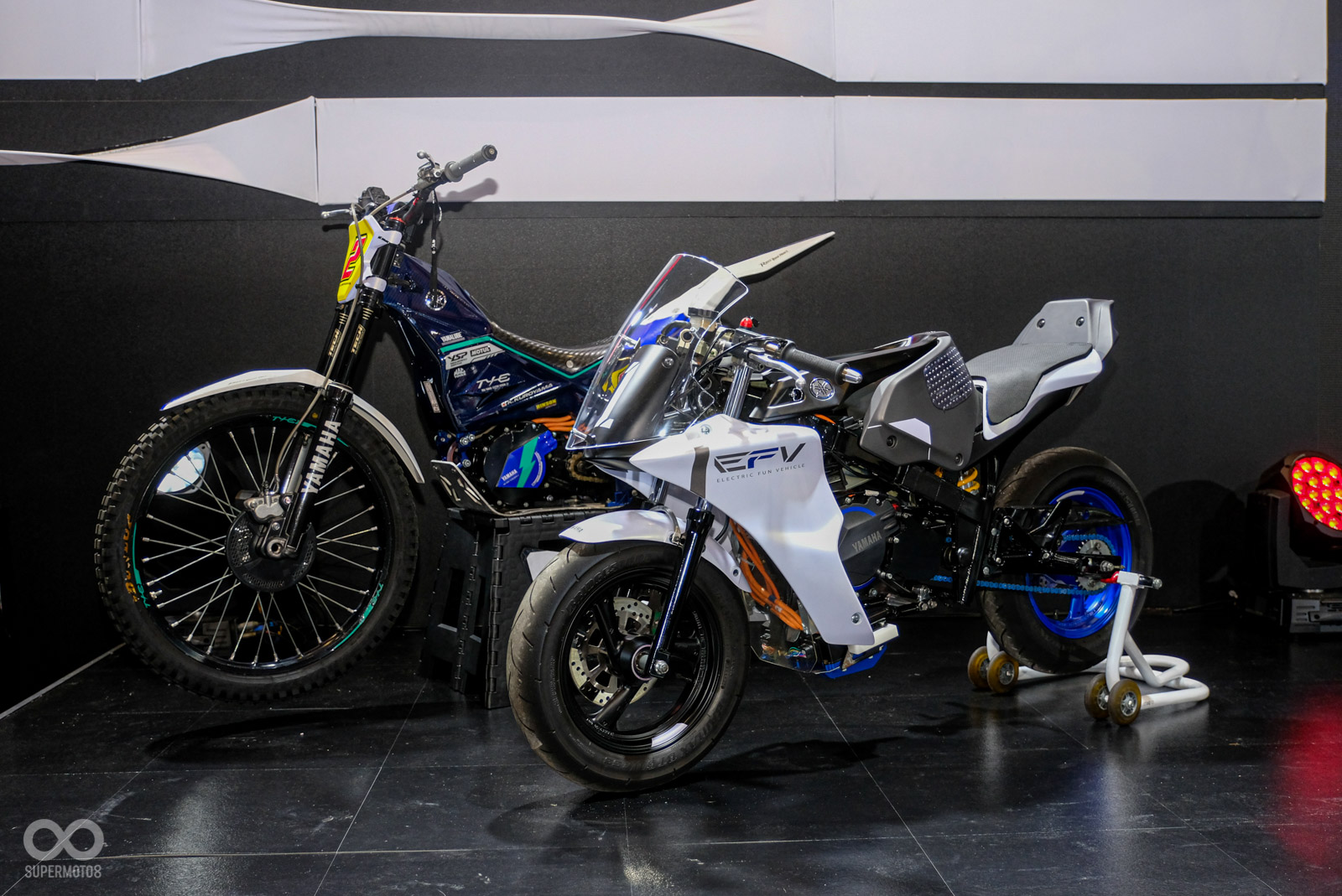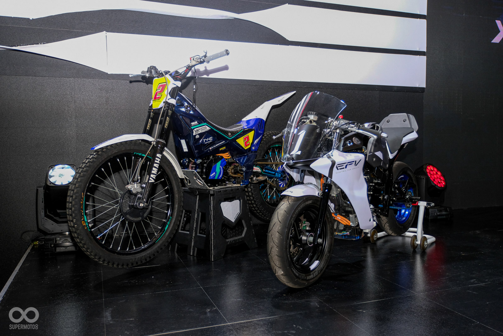 吸睛程度不輸YZR-M1的第二款車型,絕對就是這次遠道而來的電動概念車E-FV,這台電動小仿賽是由YAMAHA內部一群年輕工程師們,利用閒暇時刻自主研發打造的概念作品,動力心臟源自同樣來到2024國際重型機車現場的另一台電動越野車TY-E的電動馬達。