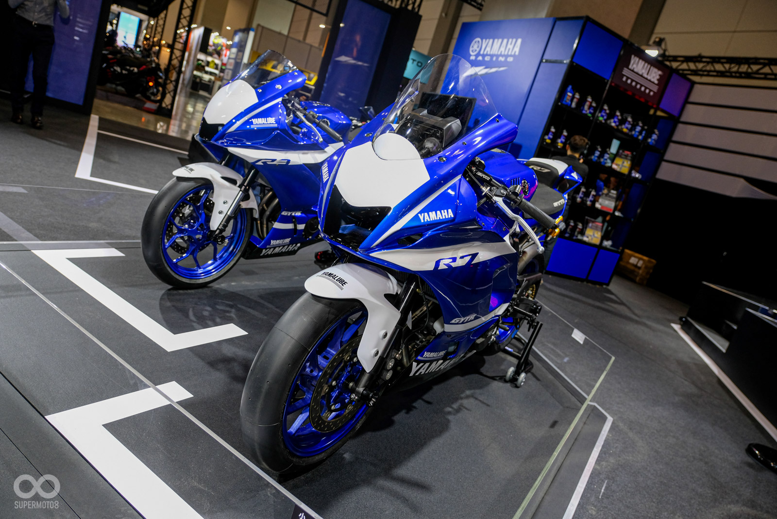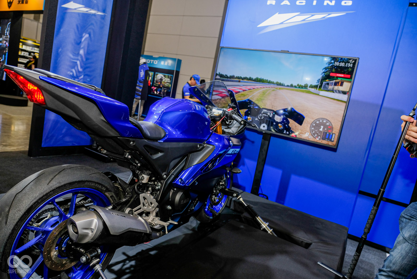 另外現場也準備額外的驚喜,台灣山葉正式帶來R3 GYTR廠車、R7 GYTR廠車來到現場,兩款車都經過原廠輕度改裝,移除車燈、換上腳踏、排氣管、避震器、手把等改裝品提升戰鬥力,相當帥氣;此外,現場更直接擺上一台連接了傾倒偵測平台MotoGP模擬器,讓民眾可以進行挑戰最直接的殺彎樂趣。