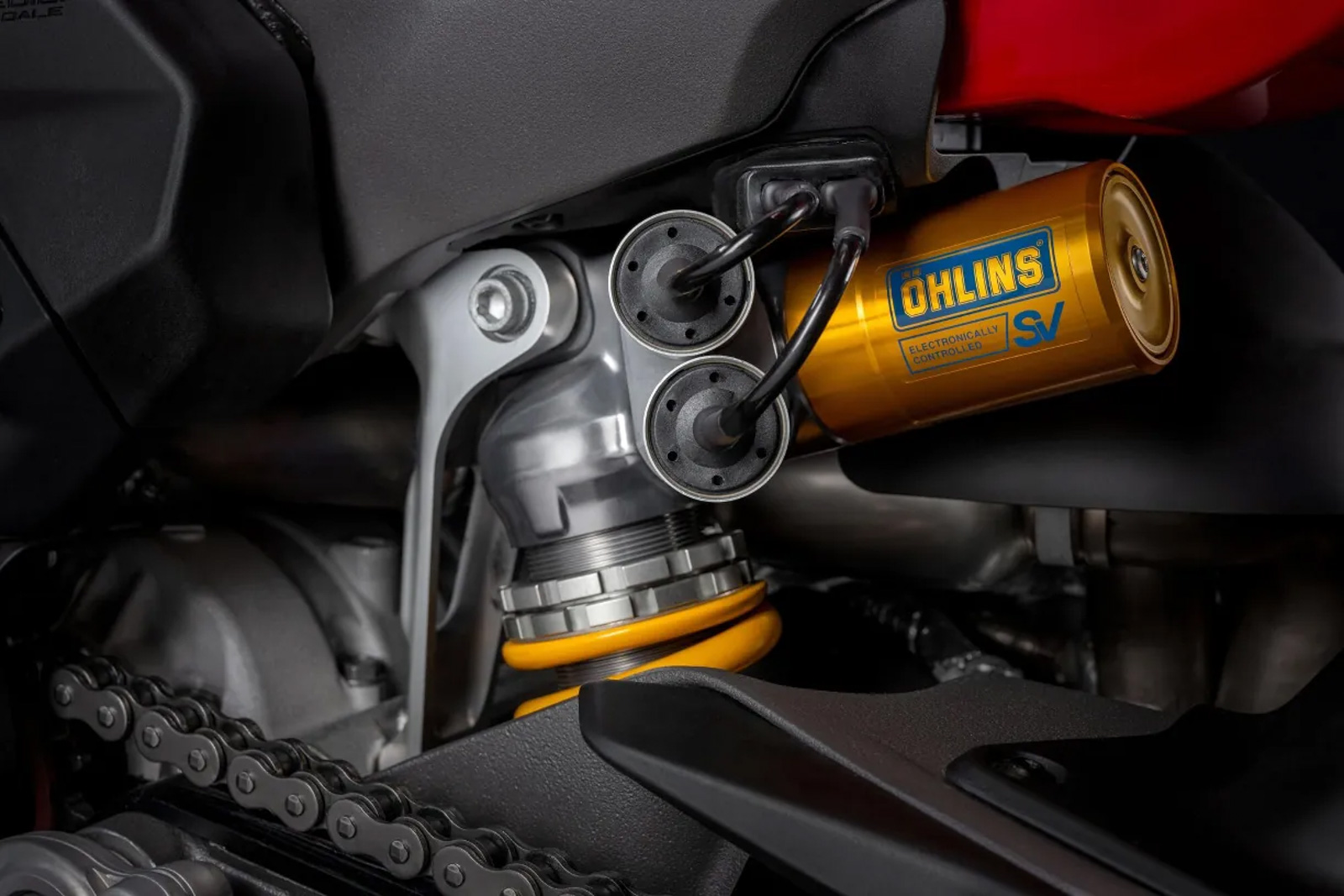懸吊方面,2025 Panigale V4 S採用Öhlins第三代的電子懸吊,前後分別為NPX-30倒立式前叉與TTX 36單槍後避震,另外也配備有Öhlins的防甩頭;標準版的Panigale V4則是採用43MM Showa 全可調倒立式前叉配上Sachs的全可調單槍後避震,搭配的防甩頭則是採用Sachs製品。