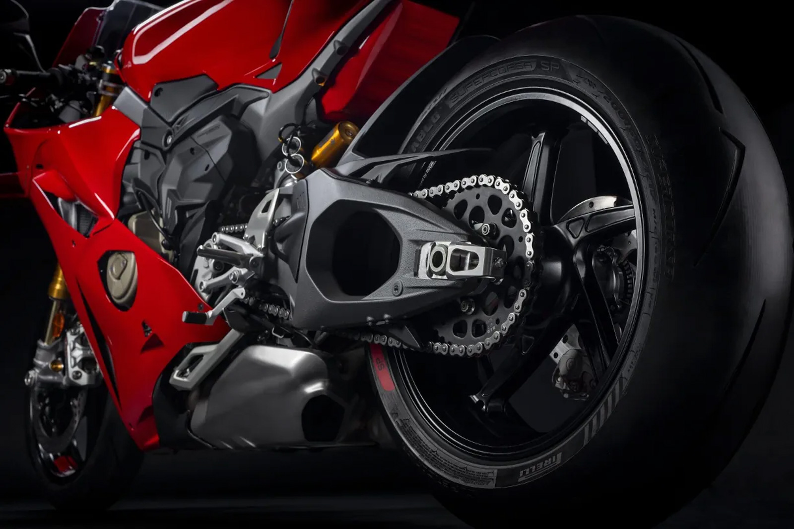 車架方面,DUCATI表示這次改款的目標,是在不降低縱向剛性的情況下,重新調整Panigale V4/S的側向剛性,他們在開發時推出了兩款不同的後搖臂,一組單搖臂、一組雙搖臂提供給車手進行測試,最終雙搖臂勝出,根據DUCATI表示,全新開發的「空心對稱雙搖臂」擁有比前一代單搖臂減少37%的側向剛性,同時也減輕了後搖臂的重量,讓Panigale V4/S在出彎加速時,具備更好的後輪牽引力和自由度。