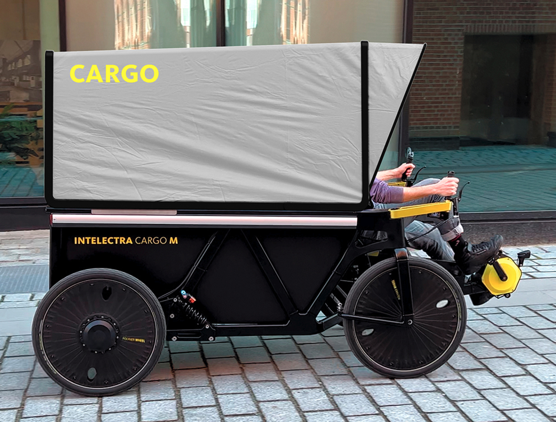 Intelectra 的外觀與市面上常見的電動自行車、三輪車或四輪車截然不同。它擁有獨特的傾斜式貨台,搭配粗壯的鋁合金車架和高聳的塑料輪圈,展現出強悍的氣勢。