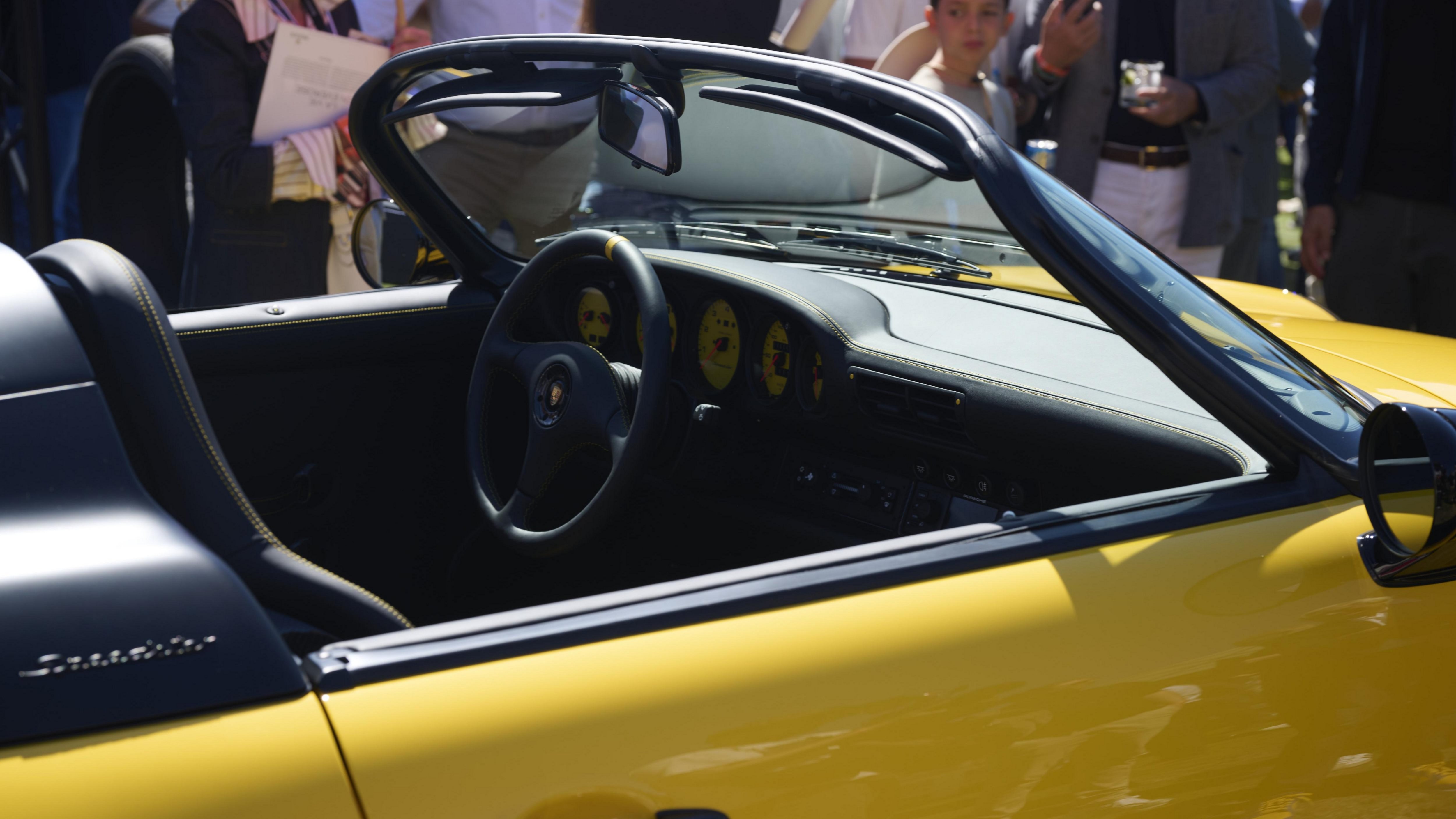 Speedster披上專為其打造的耀眼黃色塗裝—Otto Yellow,搭配黑色烤漆的18吋Turbo設計輕合金輪圈,黃色細線條點綴其中,更顯動感,後輪前方的黑色石屑護板,不僅承襲歷代Speedster的經典設計元素,更與黑色門把、前擾流板進氣口相互呼應,展現運動氣息,Sonderwunsch(特殊願望)計畫團隊更從911 Turbo(993)汲取靈感,為這款「Factory One-Off」車型注入前擾流板、側裙和後尾翼等跑車元素,同時重新詮釋轉向燈、尾燈和燈條的設計,完美融合經典與現代兩種風格。