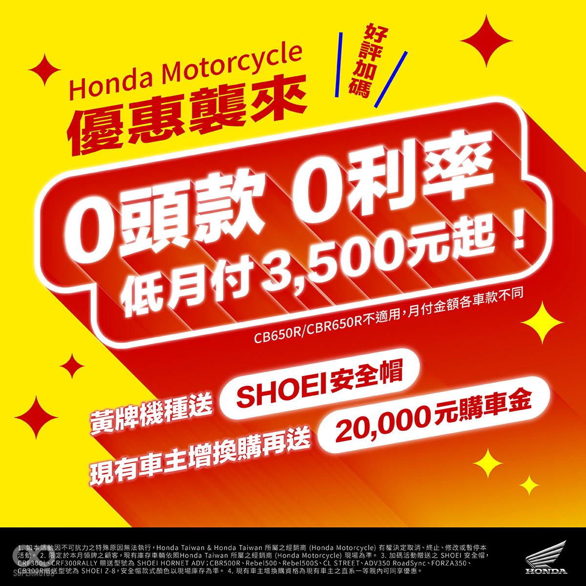 為了感謝所有喜愛Honda Motorcycle顧客的支持,特別推出「優惠襲來 好評加碼」活動,全車系享零頭款、零利率、低月付3500起(CB650R/CBR650R不適用),讓所有顧客皆能更加輕鬆入手夢想座駕。並加碼針對各式風格黃牌機種推出購車並完成領牌即贈送Shoei安全帽的活動,復古輕巧美感CB300R帥得狠,省得更狠 限量狂享現金優惠價19.9萬,讓所有喜愛Neo Sports Café的顧客,輕鬆享受騎乘樂趣。此外,為了感謝所有Honda Motorcycle車主長久以來的支持,推出現有車主增換購新車即補助兩萬購車金優惠方案,Honda Taiwan期許能與更多喜愛二輪生活的顧客一同分享騎乘的喜悅。歡迎大家蒞臨全台經銷據點,選購屬於自己的駕馭夢想!
