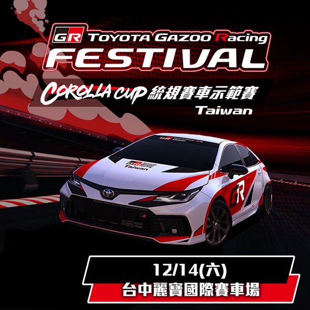 首場公開活動「Corolla Cup統規賽示範賽」將於GR Festival活動當天(12/14)隆重登場,以特邀專業賽車手形式展現統規賽制的精彩競賽。誠摯邀請喜歡賽車的車迷朋友們免費入場觀賽。GR Festival相關活動內容、入場索票資訊等也將陸續於官方社群平台及官方網站公布,敬請期待!