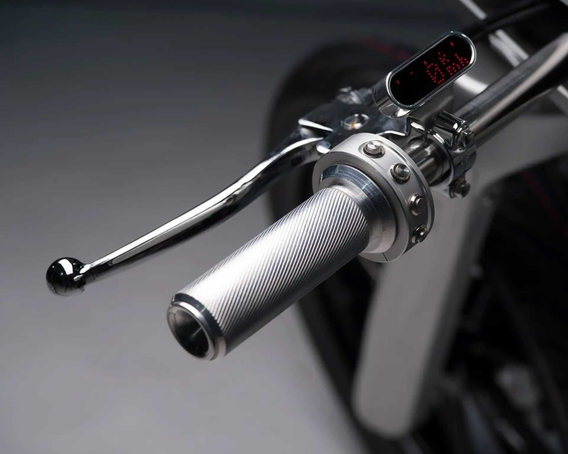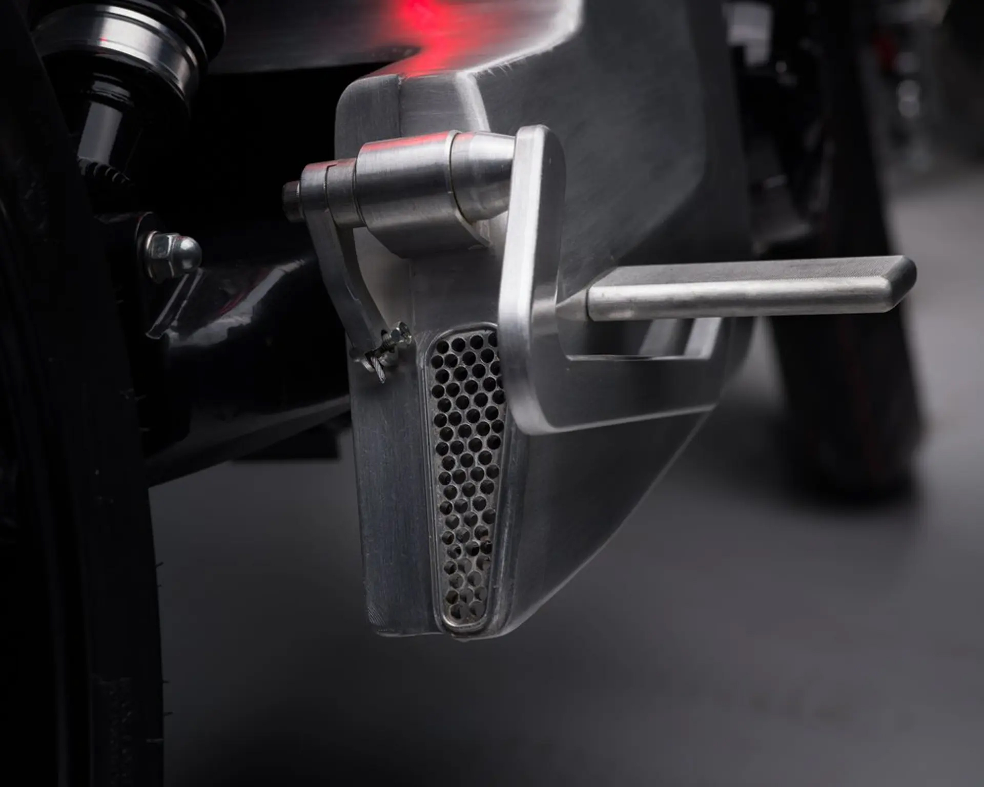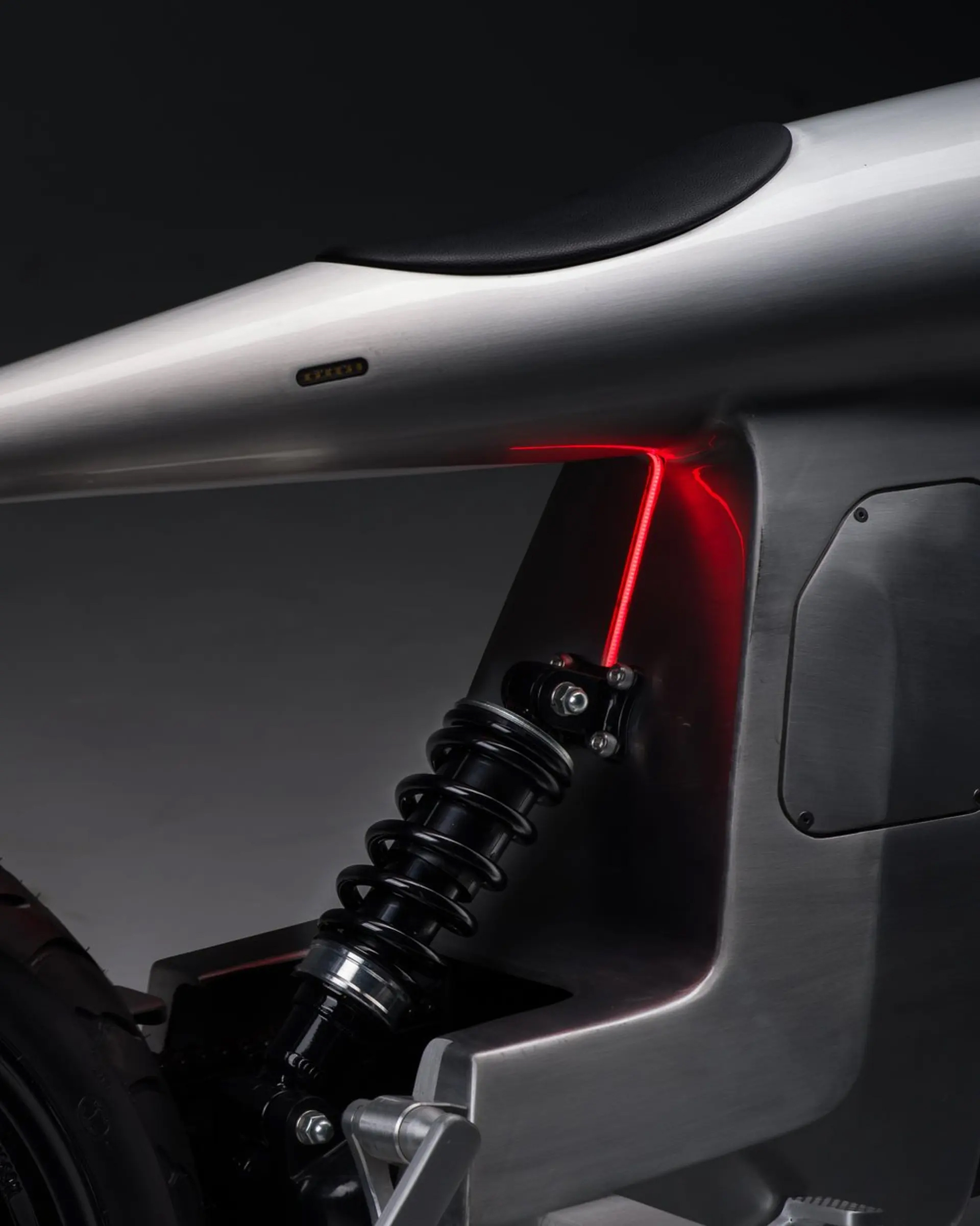 EVE Odyssey V2 用的是太空級的 7075 鋁合金打造,這種材料強度高、重量輕,車重僅有 120 公斤的摩托車擁有超輕便的金屬外殼。而那手工髮絲紋的鋁面,直接把這輛車提升到時尚 icon 的高度,簡直就是鋼鐵人的後院裡該擁有的展示品。