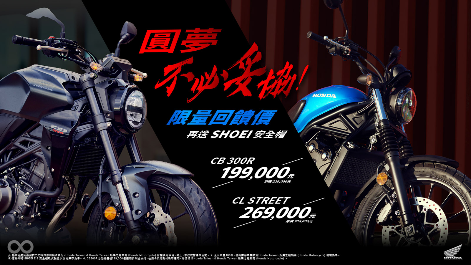 Honda Taiwan秉持著「The Power of Dreams – How we move you.」的品牌精神,以夢想為原動力,創造各式各樣的移動便利性,為台灣顧客打造「兼顧樂趣以及安全的重機騎乘環境」,於10月推出「全方位安全守護專案」,指定車種再享高額0利率優惠,為了邀請更多車主加入二輪生活的行列,推出「圓夢不必妥協專案」限量回饋價復古輕巧CB300R 19.9萬以及盡情展現自我CL STREET 26.9萬再送Shoei安全帽,讓所有車主體驗二輪生活的騎乘樂趣的同時,展現率性風格,網路預約試乘還有機會抽中insta360,另外,為了感謝所有Honda Motorcycle車主長久以來的支持,推出現有車主增換購新車即補助一萬購車金優惠方案,心動不如馬上行動,即刻前往全台經銷據點訂購心儀車款!