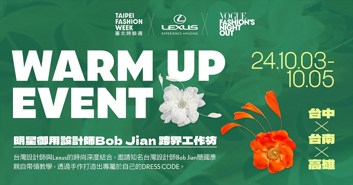 臺北時裝週每年都能吸引大批北部民眾前來共襄盛舉,今年為讓中南部Lexus車主也能感受時尚魅力,Lexus特別與Vogue攜手舉辦《時尚手作工坊》,邀請演藝圈御用設計師Bob Jian 簡國彥,傳授他的獨門設計心法,帶領 Lexus 車主踏入精緻又別出心裁的手作世界、並做出獨一無二的華麗時尚配件。於10/3(四)-10/5(六)期間共3場工作坊,相信能讓Lexus車主親身體驗到與眾不同的時尚風格!