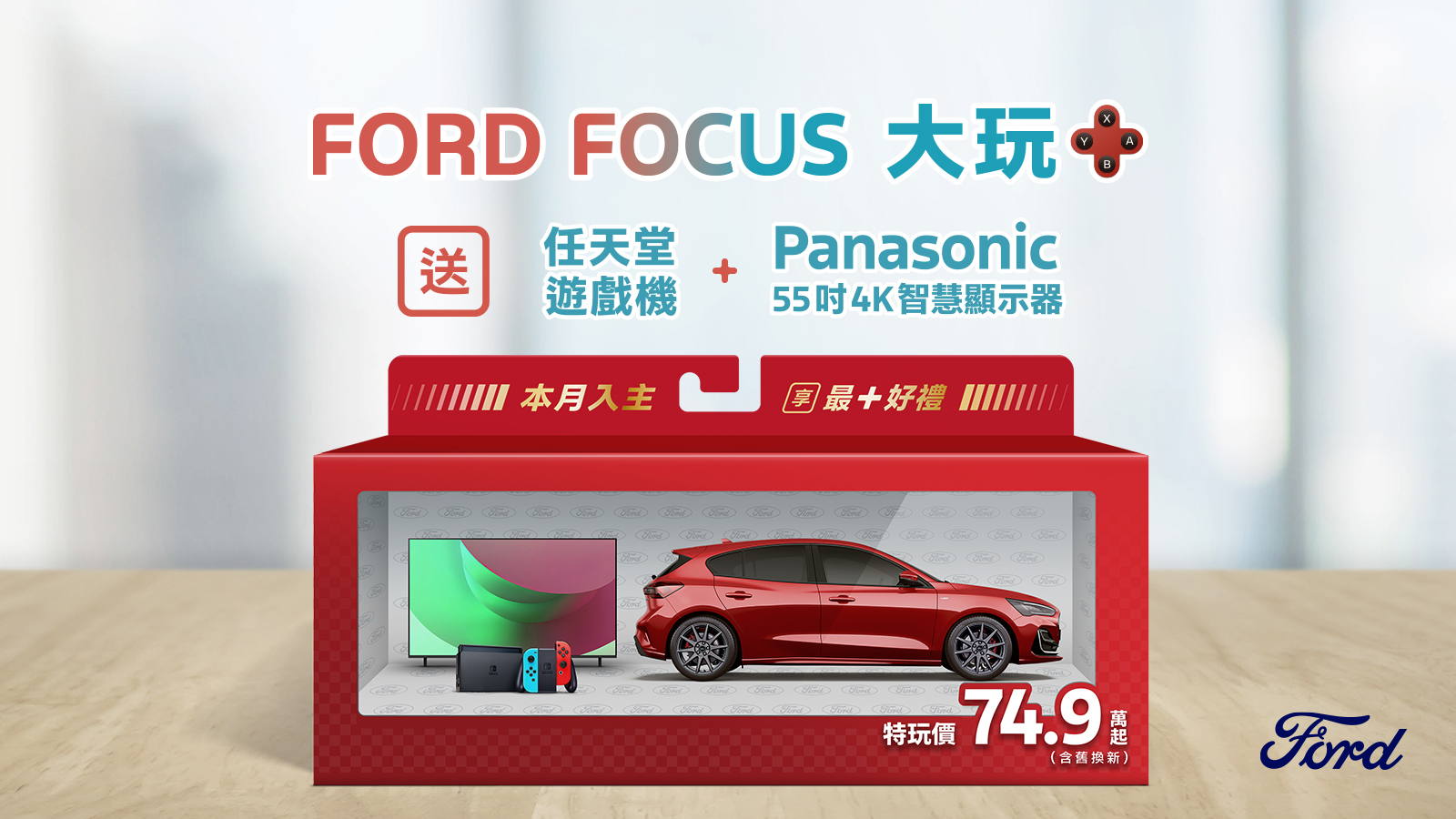 Ford Focus以多元車型滿足消費者個人及家庭乘載之用車需求,國產全車系額外加碼「大玩+」禮包,總價值近3.5萬元,內含任天堂遊戲機以及Panasonic 55吋4K HDR液晶智慧顯示器,不僅滿足行車駕駛樂趣,還兼顧休閒時光享受;Focus搭載EcoBoost®182渦輪增壓汽油引擎,擁有同級最佳182ps最大馬力,以及最高17.1km/L的高效油耗表現,輕鬆遊走城市山林之間。