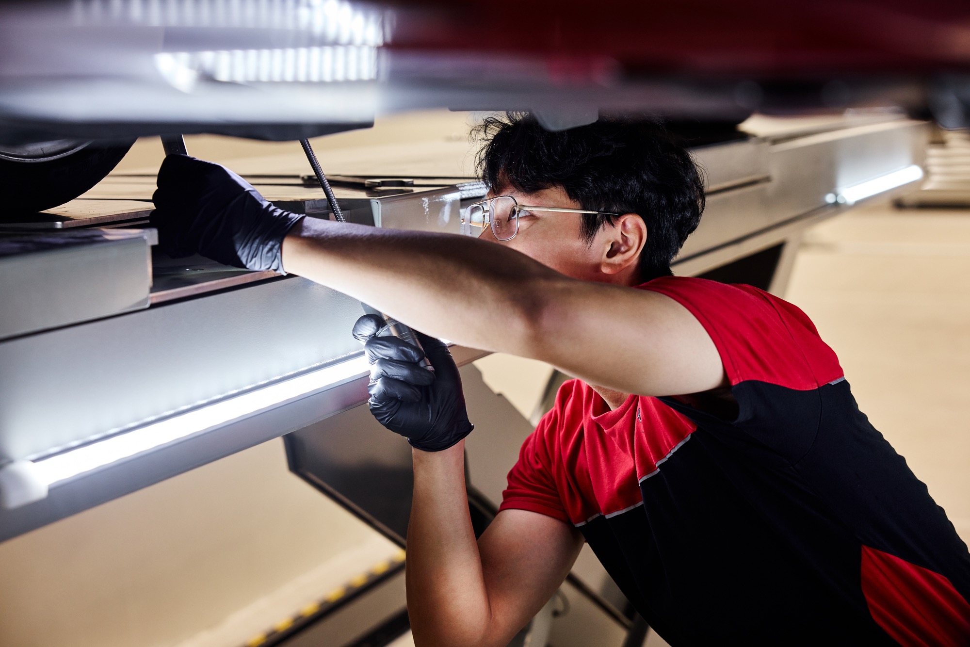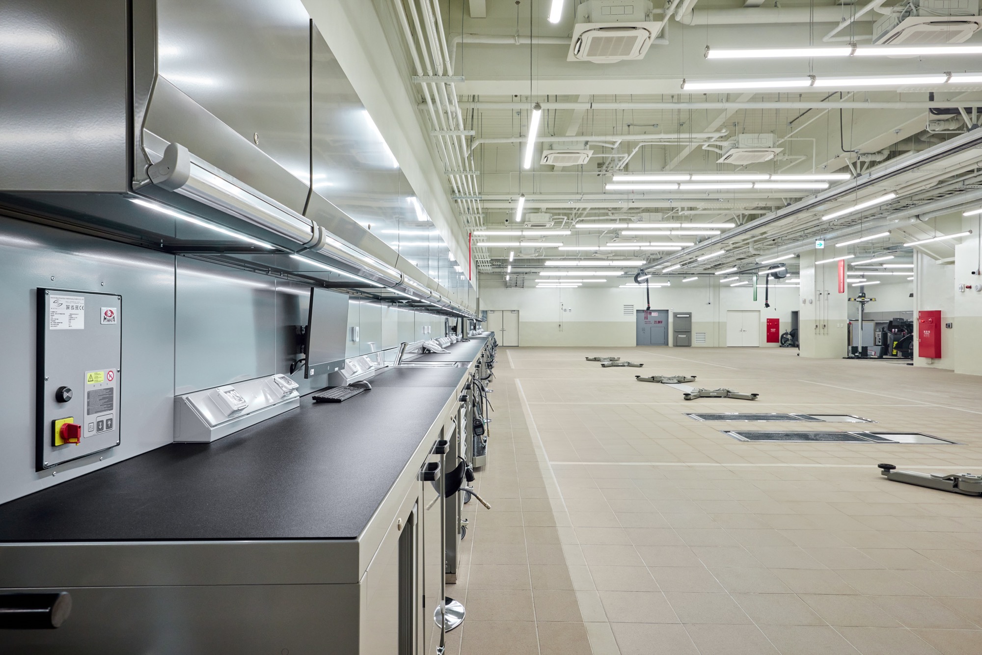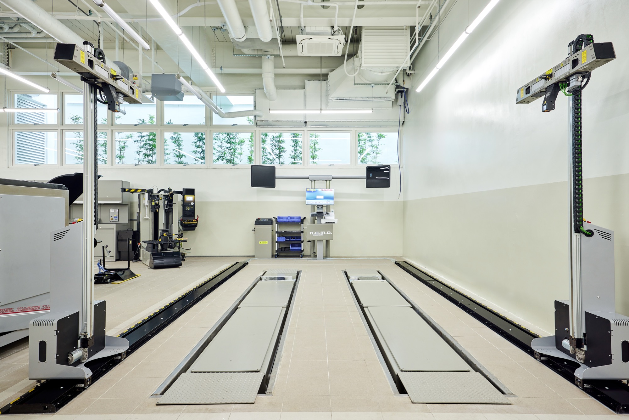 B1 – 售後服務區。在地下一樓的售服工作區設有 : 人因工學維修站、全自動拆胎機、專屬頂高洗車區、底盤與輪胎檢查區、ADAS校正區、非接觸式定位儀、零件存放區,及MAHA地埋雙柱頂高機。