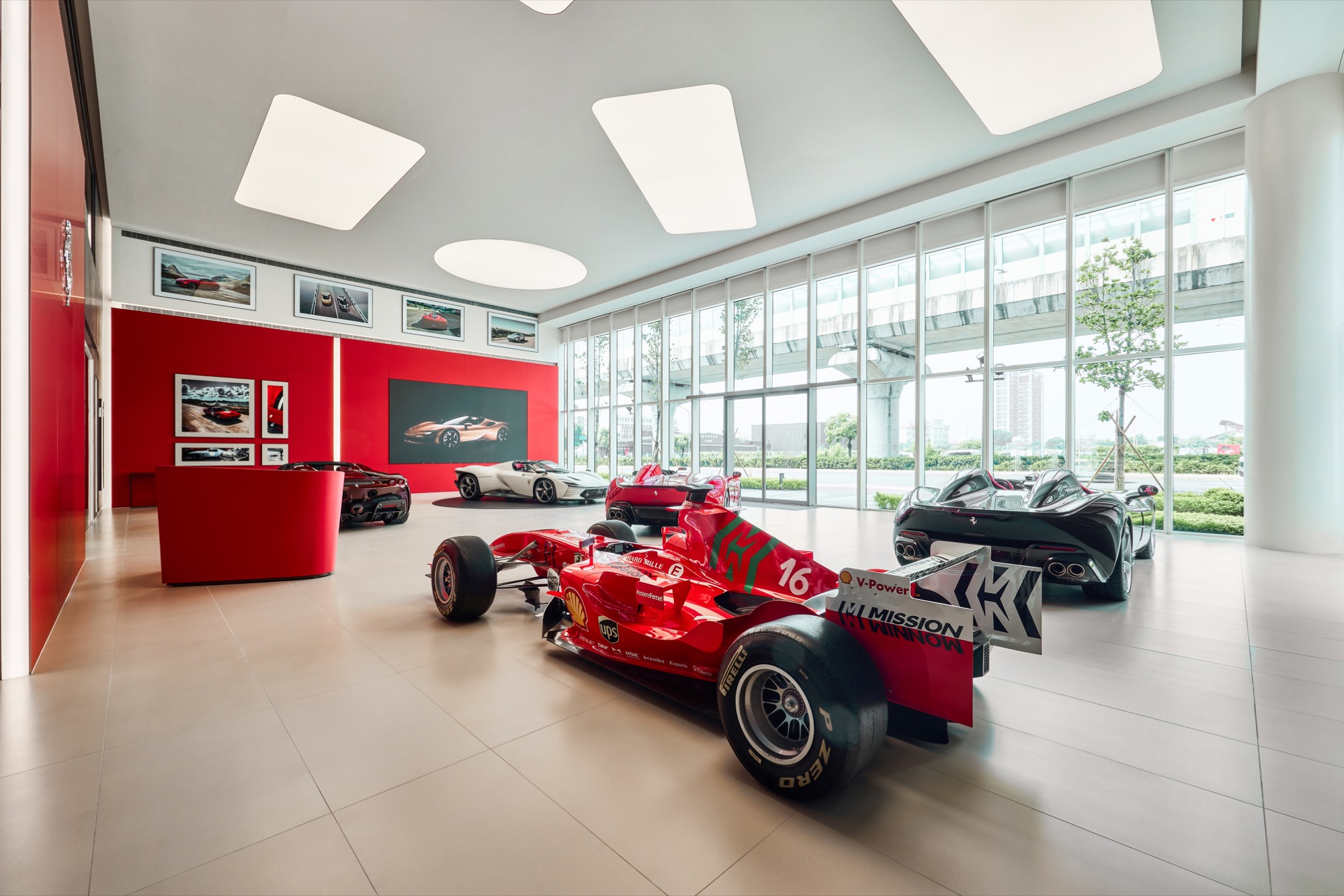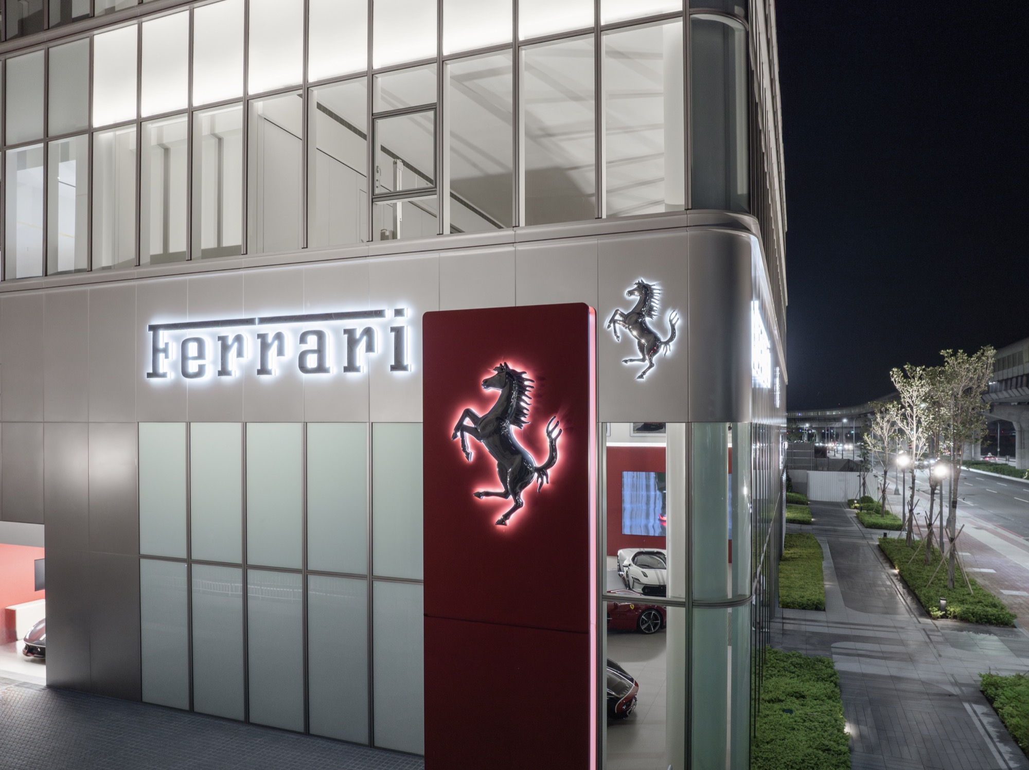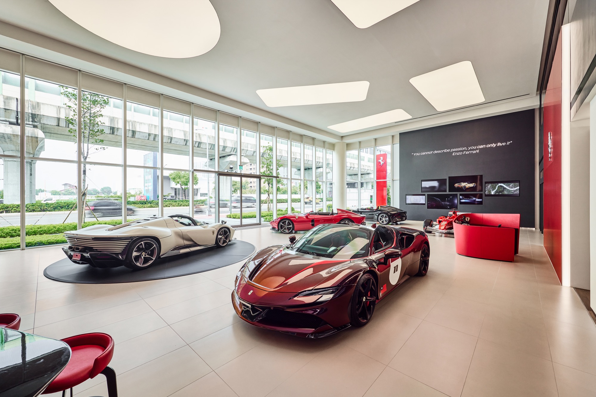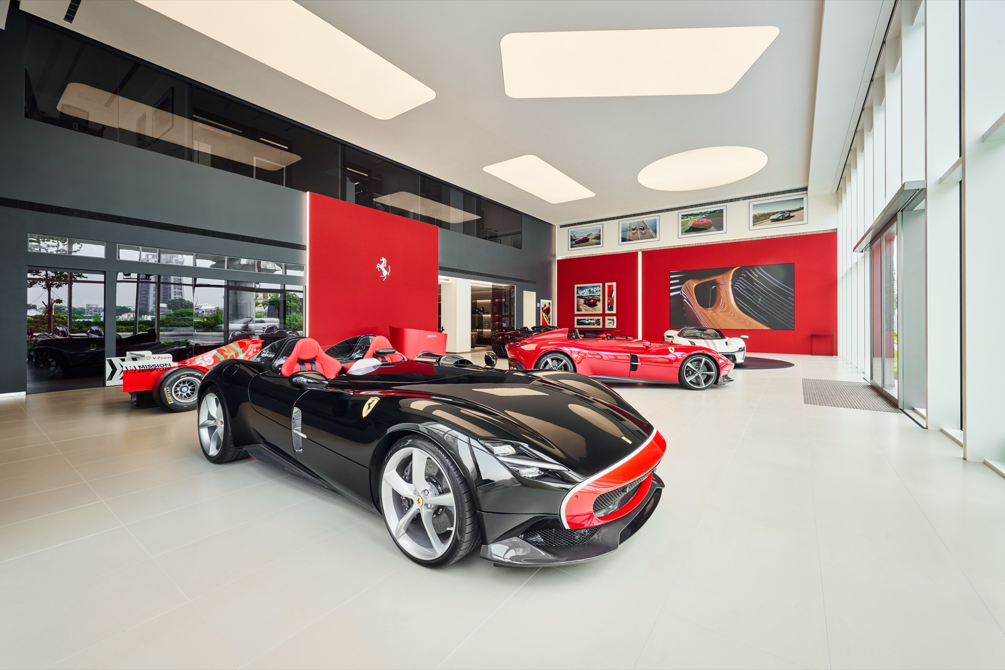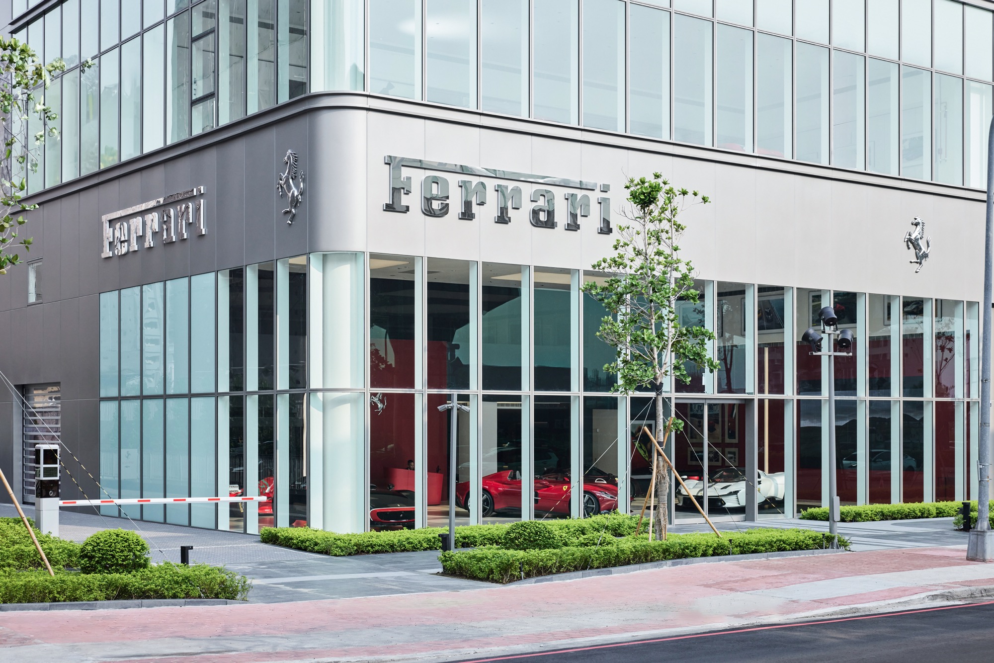 全新建築以俐落的線條勾勒出整體設計輪廓,沉穩內斂的灰色系外觀,搭配來自義大利原裝的頂級家俱及設備,完美襯托來自義大利超跑領導品牌Ferrari的奢華與細膩。在建物規劃上,除了寬裕且通透的車輛展示區、個性化選配區與奢華的客戶休息區外,於二樓更打造獨一無二的空間,透過一字排開的歷代Scuderia Ferrari F1戰駒模型與F1賽車相關展品,忠實呈現躍馬品牌源自賽道的熱情與傳奇。