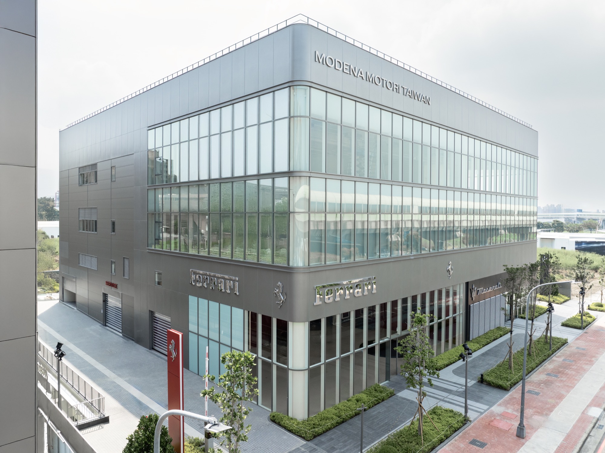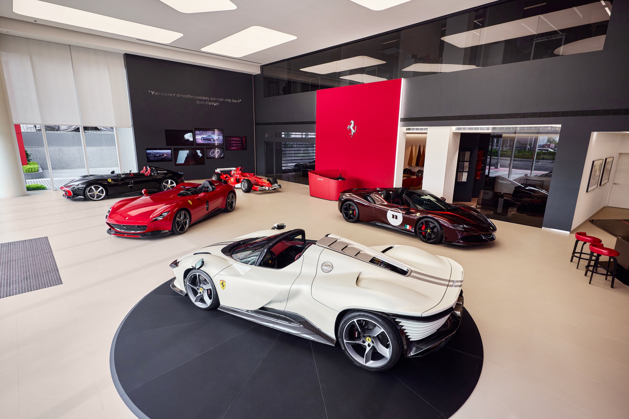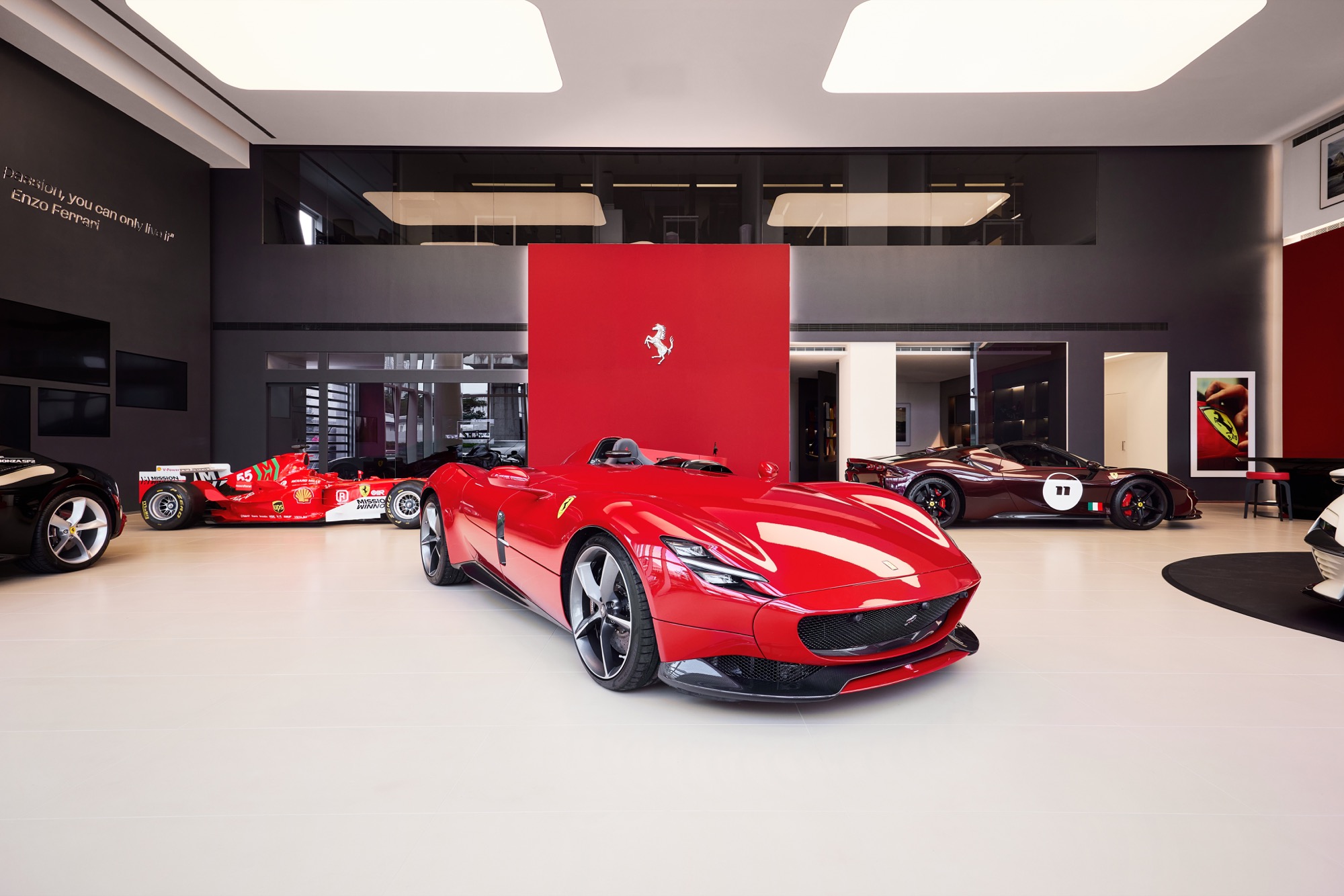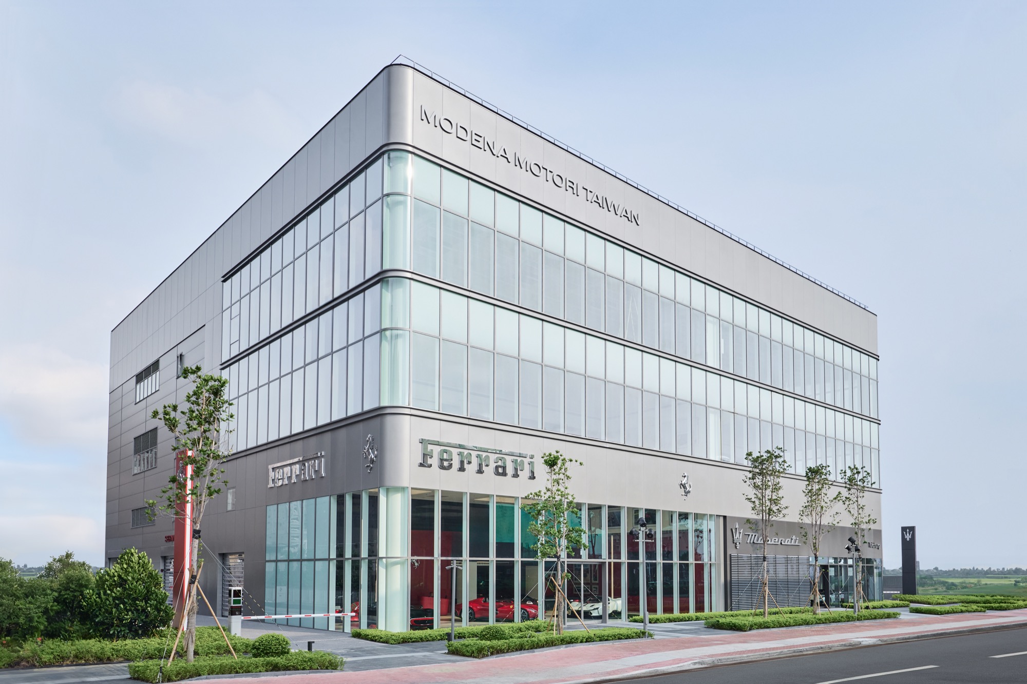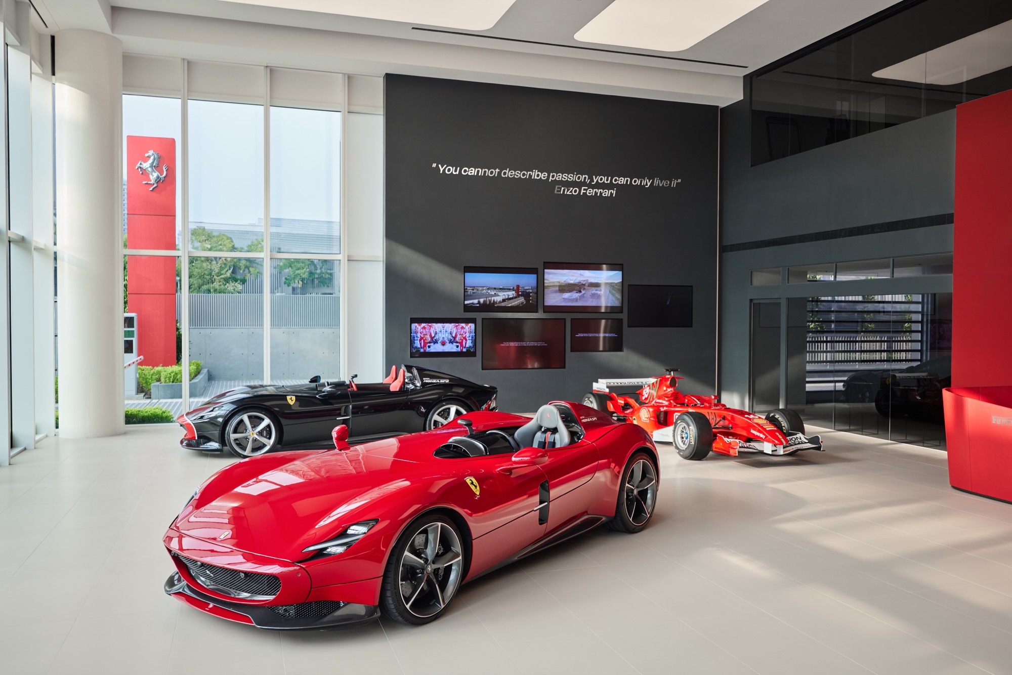 全新建築以俐落的線條勾勒出整體設計輪廓,沉穩內斂的灰色系外觀,搭配來自義大利原裝的頂級家俱及設備,完美襯托來自義大利超跑領導品牌Ferrari的奢華與細膩。在建物規劃上,除了寬裕且通透的車輛展示區、個性化選配區與奢華的客戶休息區外,於二樓更打造獨一無二的空間,透過一字排開的歷代Scuderia Ferrari F1戰駒模型與F1賽車相關展品,忠實呈現躍馬品牌源自賽道的熱情與傳奇。