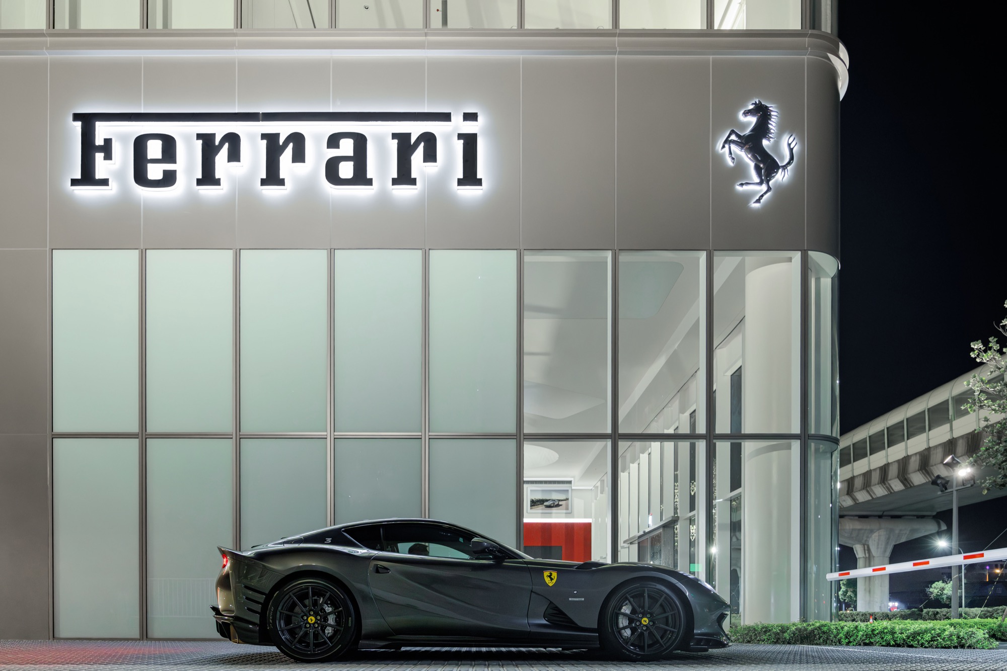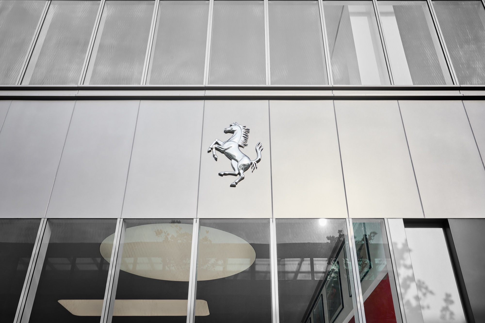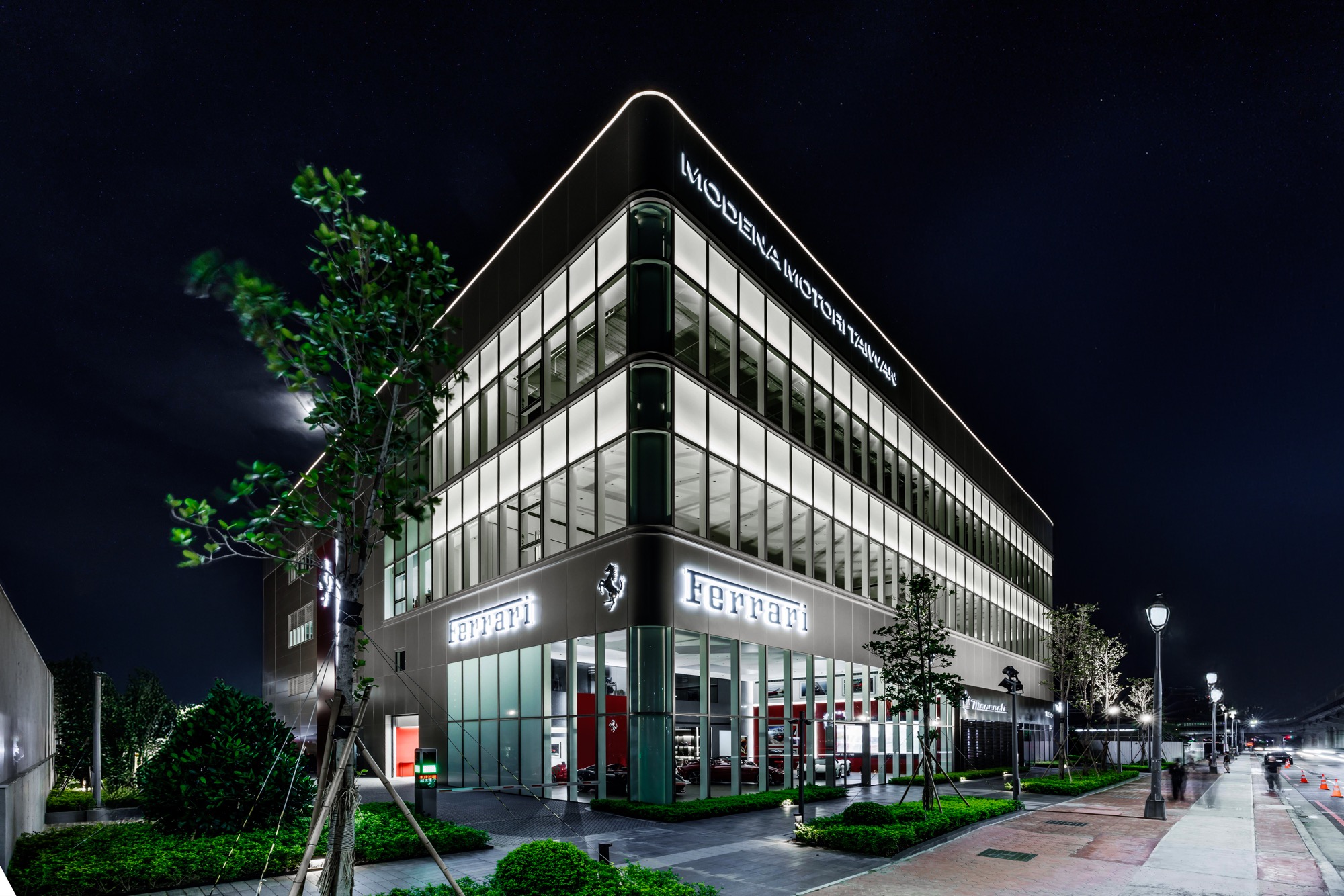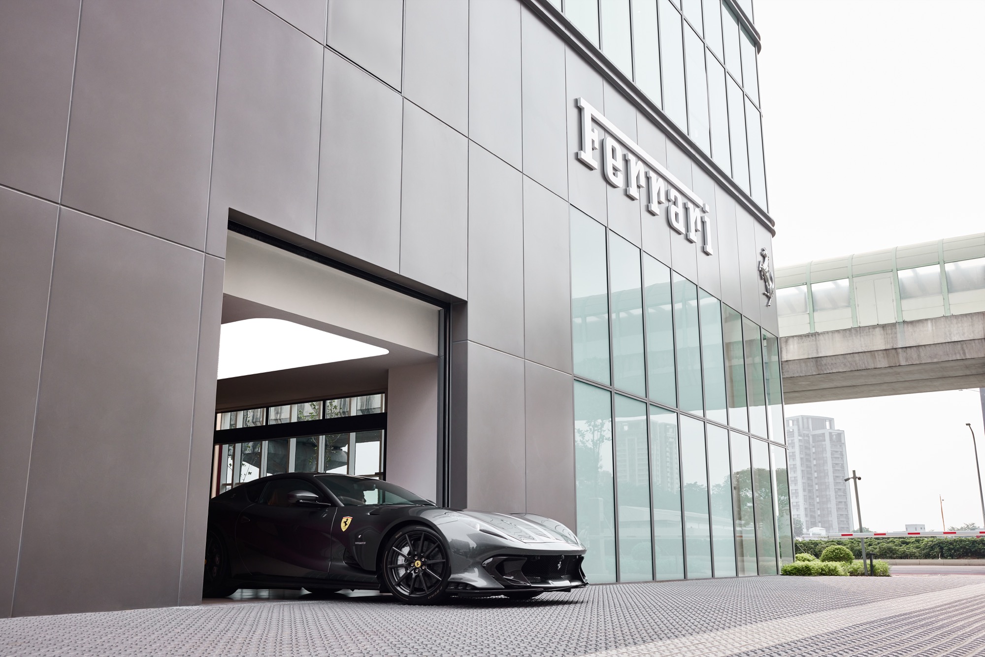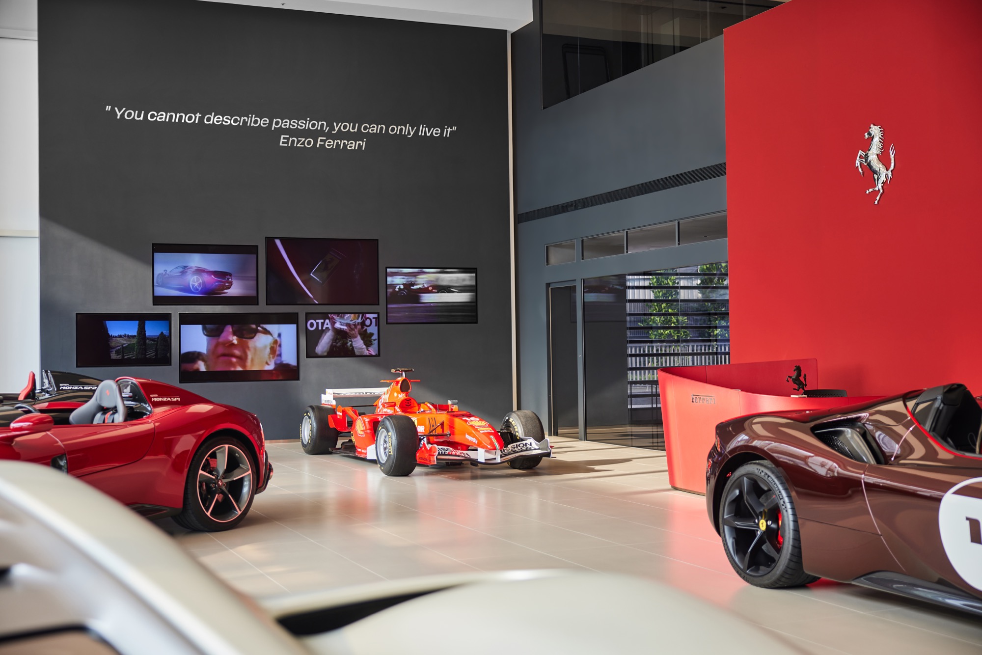 全新建築以俐落的線條勾勒出整體設計輪廓,沉穩內斂的灰色系外觀,搭配來自義大利原裝的頂級家俱及設備,完美襯托來自義大利超跑領導品牌Ferrari的奢華與細膩。在建物規劃上,除了寬裕且通透的車輛展示區、個性化選配區與奢華的客戶休息區外,於二樓更打造獨一無二的空間,透過一字排開的歷代Scuderia Ferrari F1戰駒模型與F1賽車相關展品,忠實呈現躍馬品牌源自賽道的熱情與傳奇。