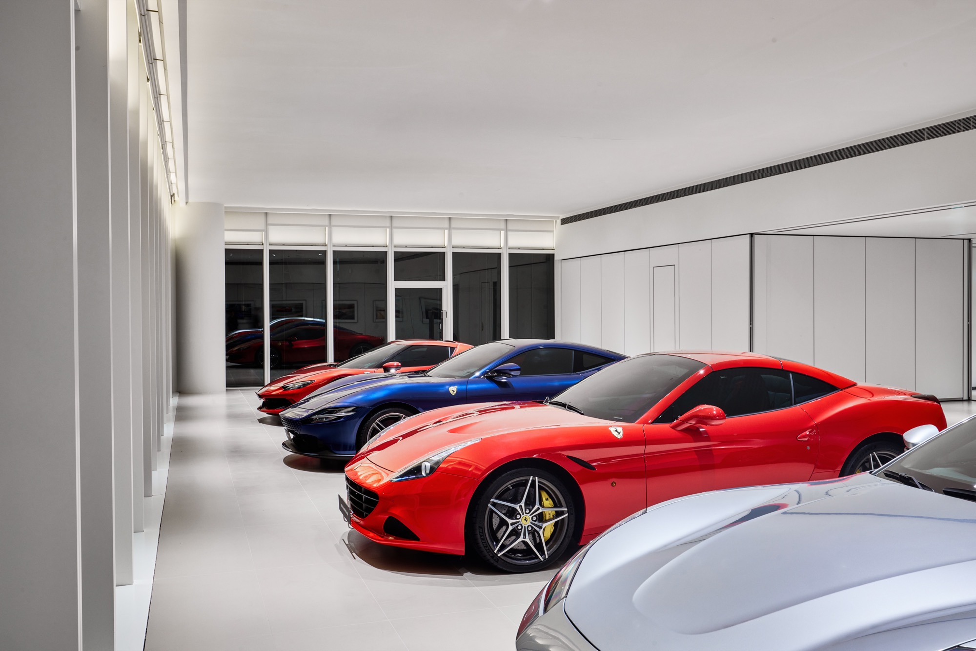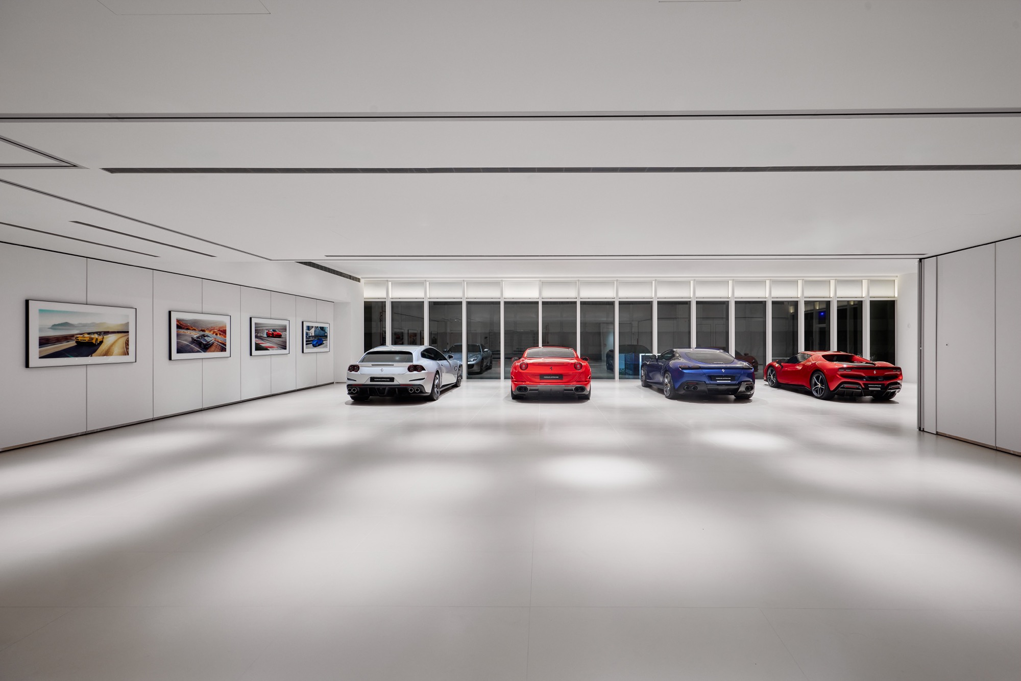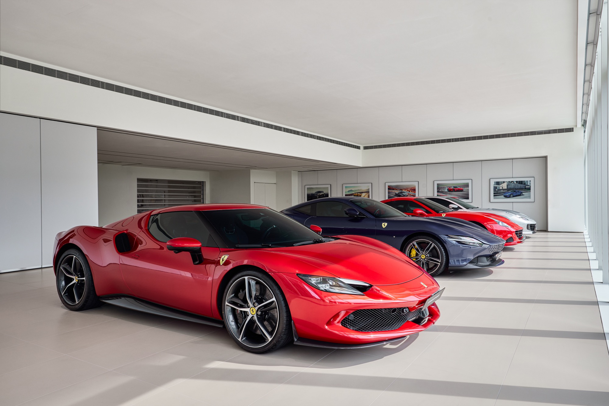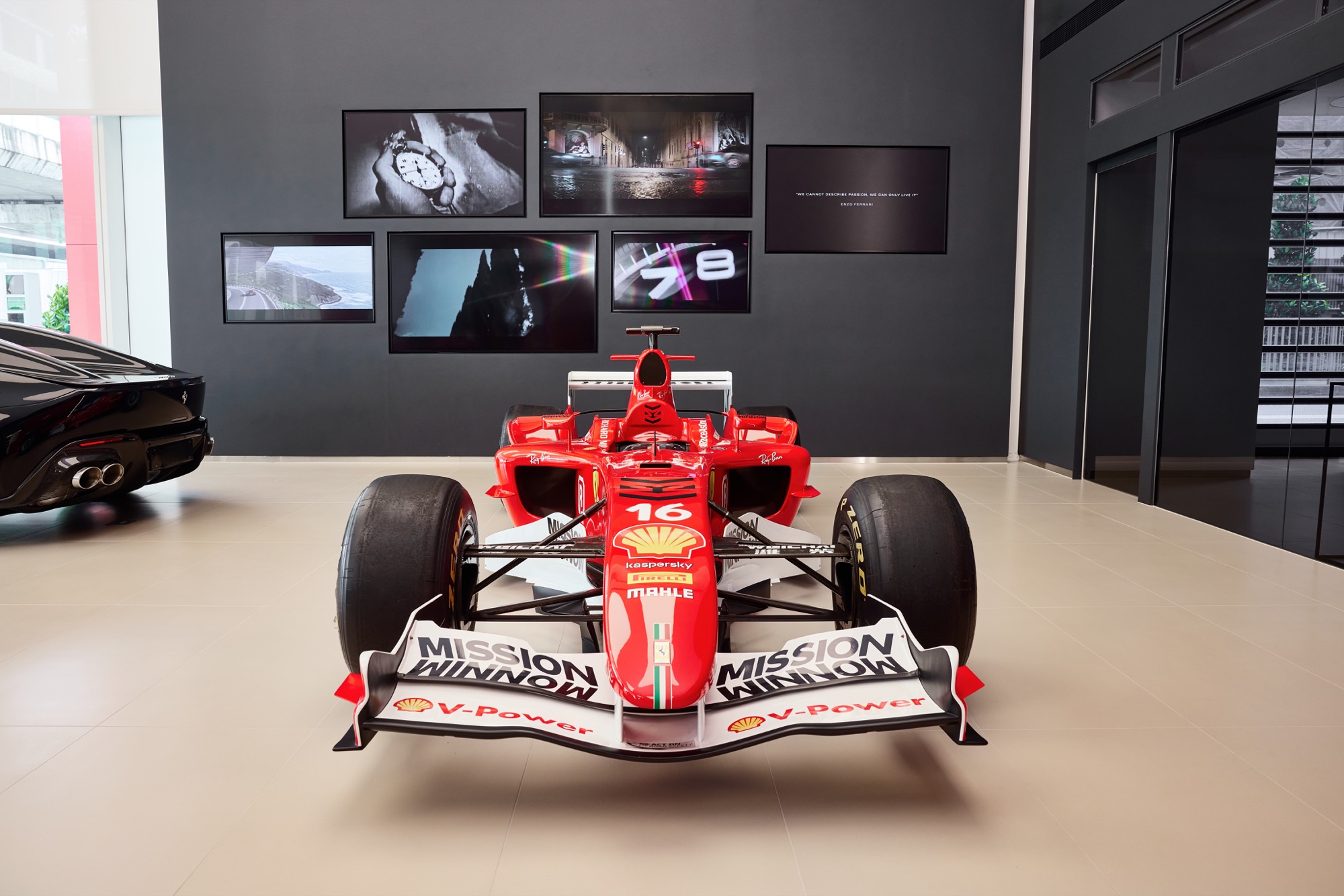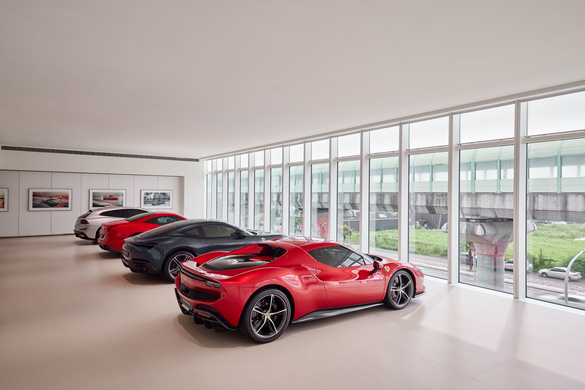 全新建築以俐落的線條勾勒出整體設計輪廓,沉穩內斂的灰色系外觀,搭配來自義大利原裝的頂級家俱及設備,完美襯托來自義大利超跑領導品牌Ferrari的奢華與細膩。在建物規劃上,除了寬裕且通透的車輛展示區、個性化選配區與奢華的客戶休息區外,於二樓更打造獨一無二的空間,透過一字排開的歷代Scuderia Ferrari F1戰駒模型與F1賽車相關展品,忠實呈現躍馬品牌源自賽道的熱情與傳奇。