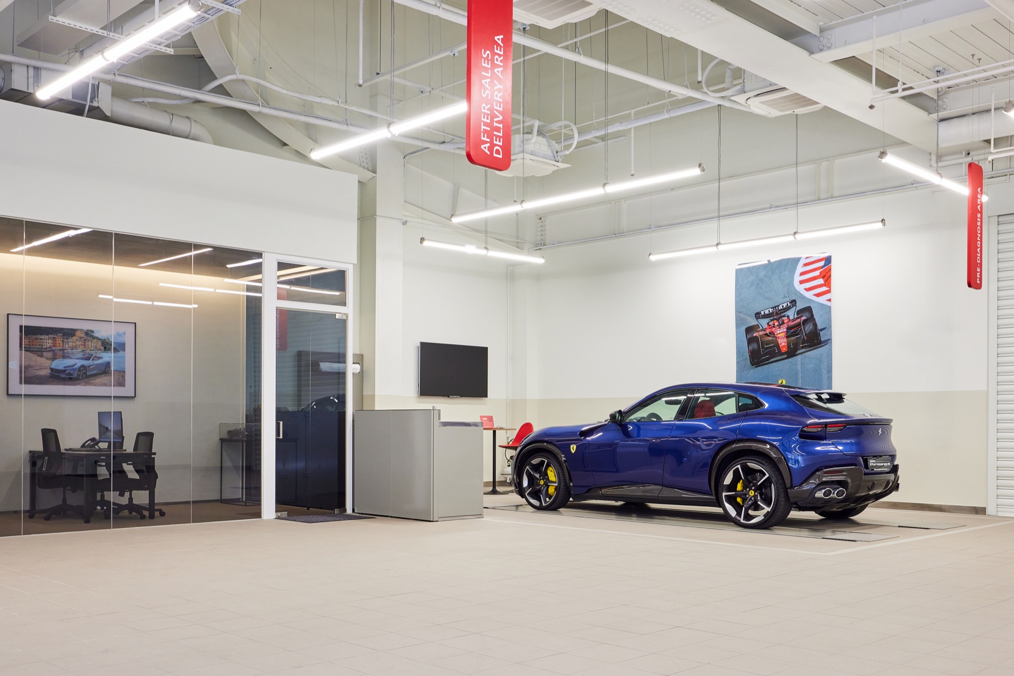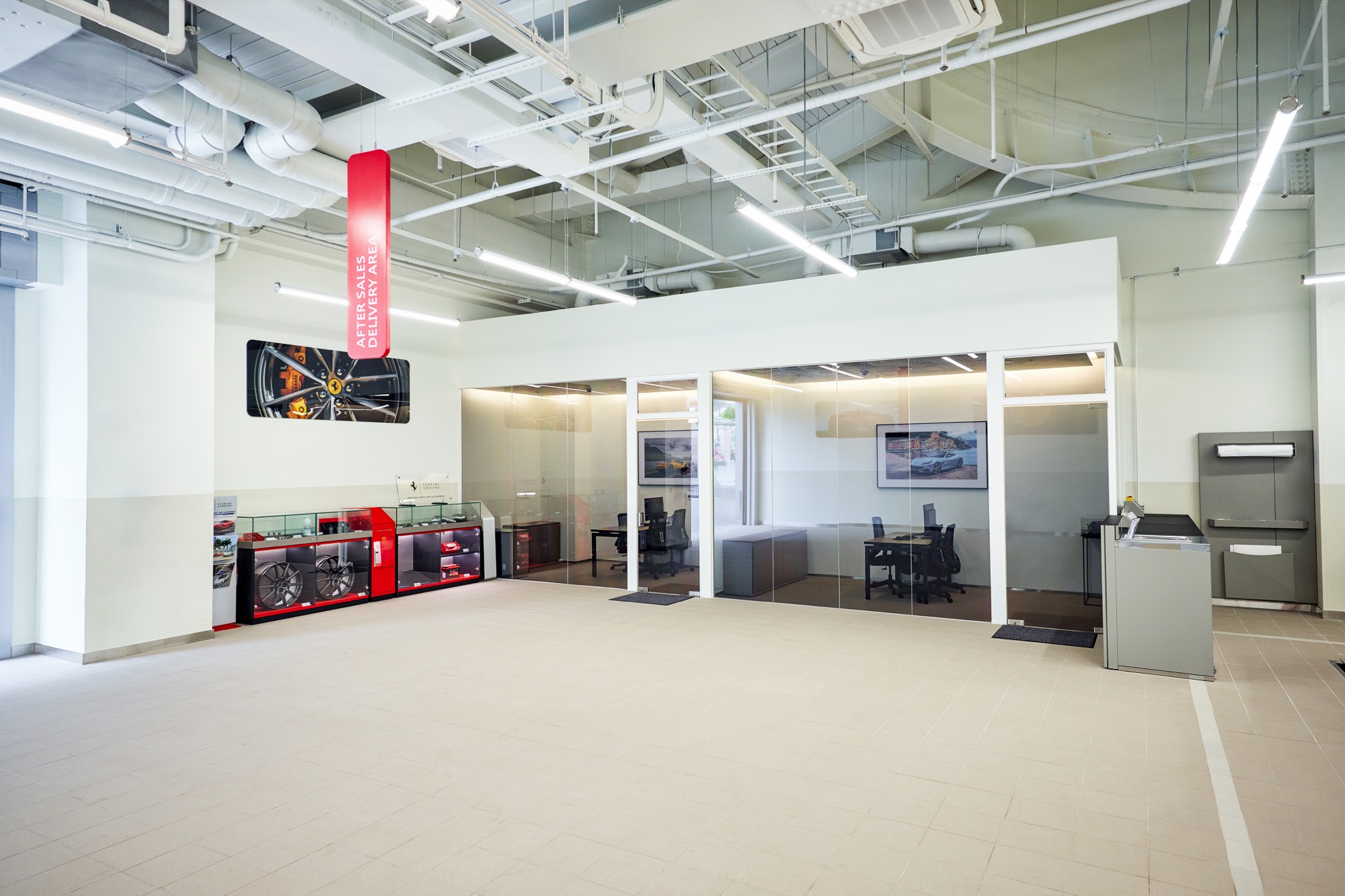 1F – 新車展示中心&售後服務接待區。一樓為接待所有回廠客戶的第一站,除設有含頂高機的檢查區外,以Ferrari品牌DNA及氛圍,打造更奢華的客休區。臺灣蒙地拿售後服務部門提供比照原廠標準的專業車輛維護,並提供延長保固方案及原廠零配件等服務,將原廠服務水準再次提升。