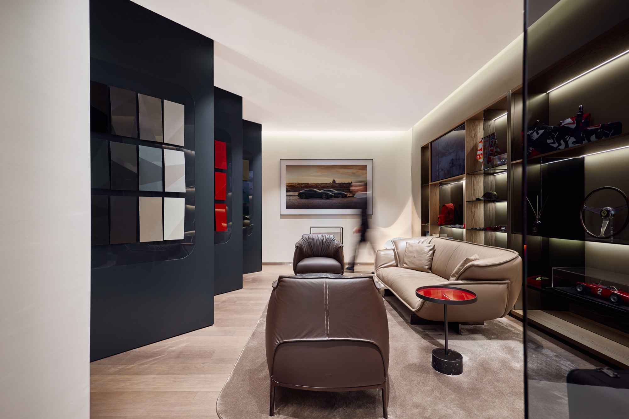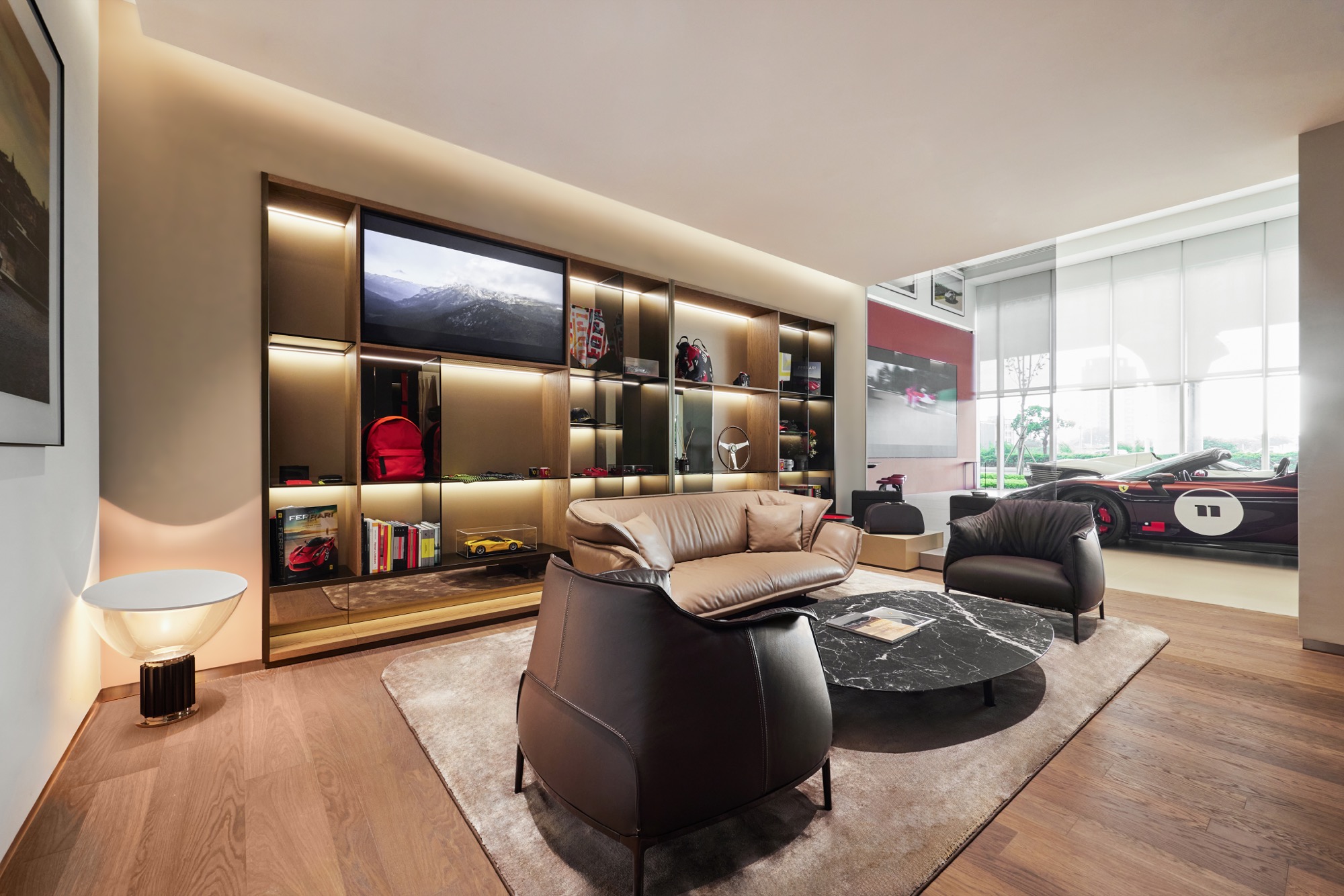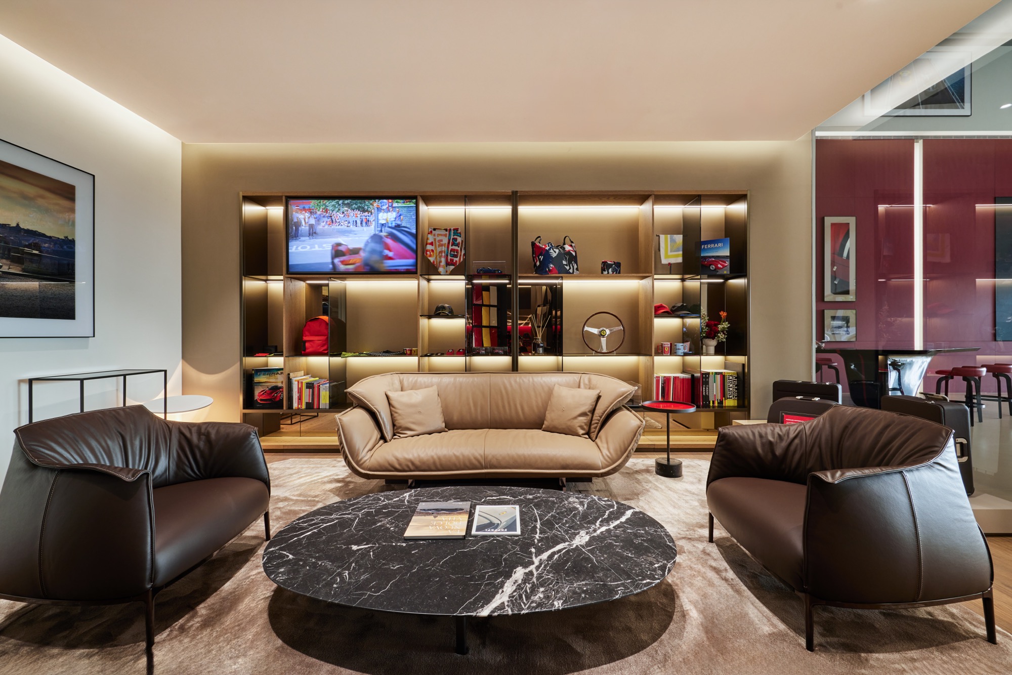 2F – Lounge。二樓設有濃厚品牌元素充斥的獨特空間,其中的Poltrona Frau頂級皮革傢俱也都來自Ferrari的故鄉義大利 ; 歷代的傳奇F1模型車陳列一字排開,及F1賽車前鼻翼與底板點綴,壯觀地呈現Ferrari 純粹的賽車靈魂,締造超越75年的璀璨篇章,更於各大賽車運動中創下無可匹敵的輝煌成就。