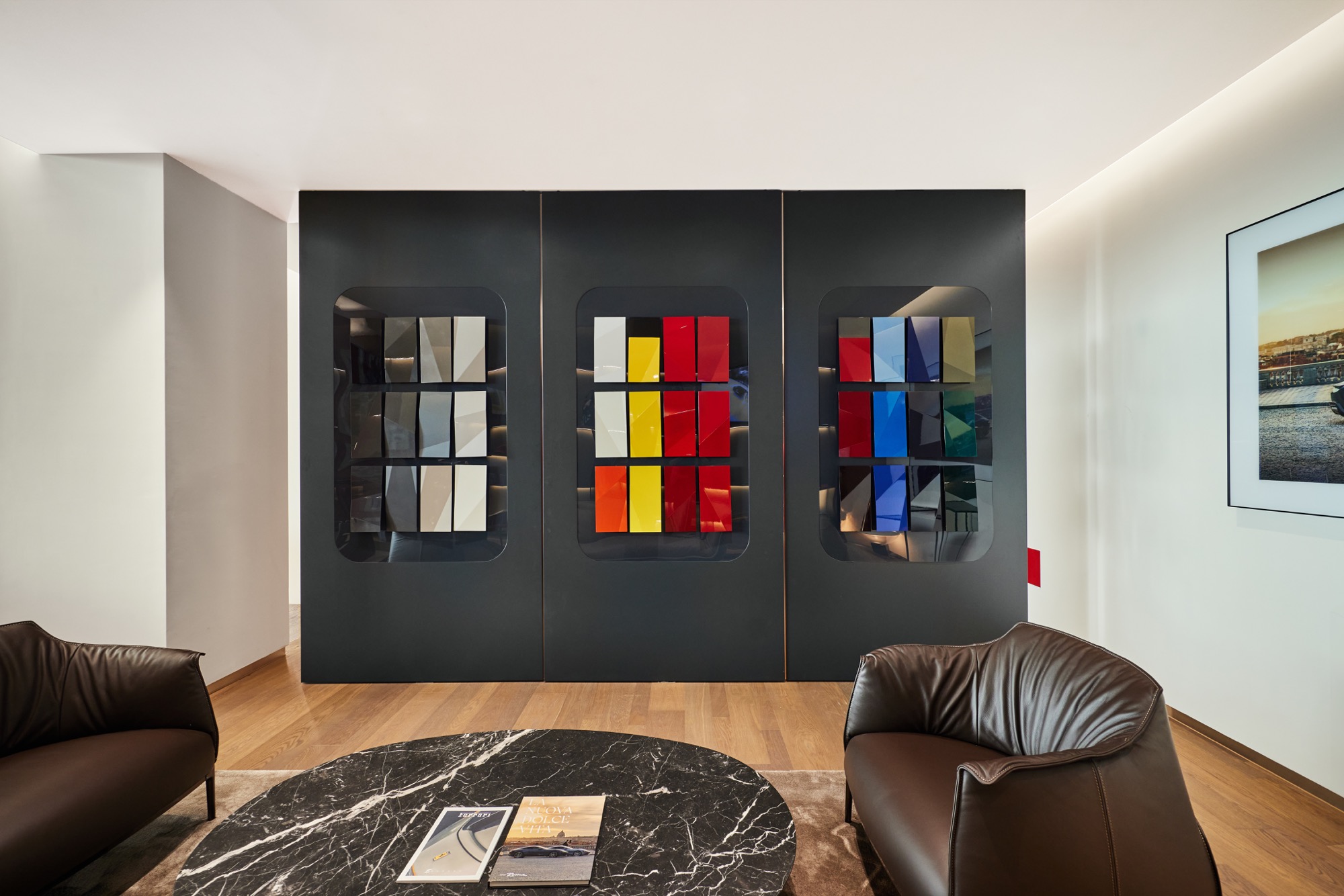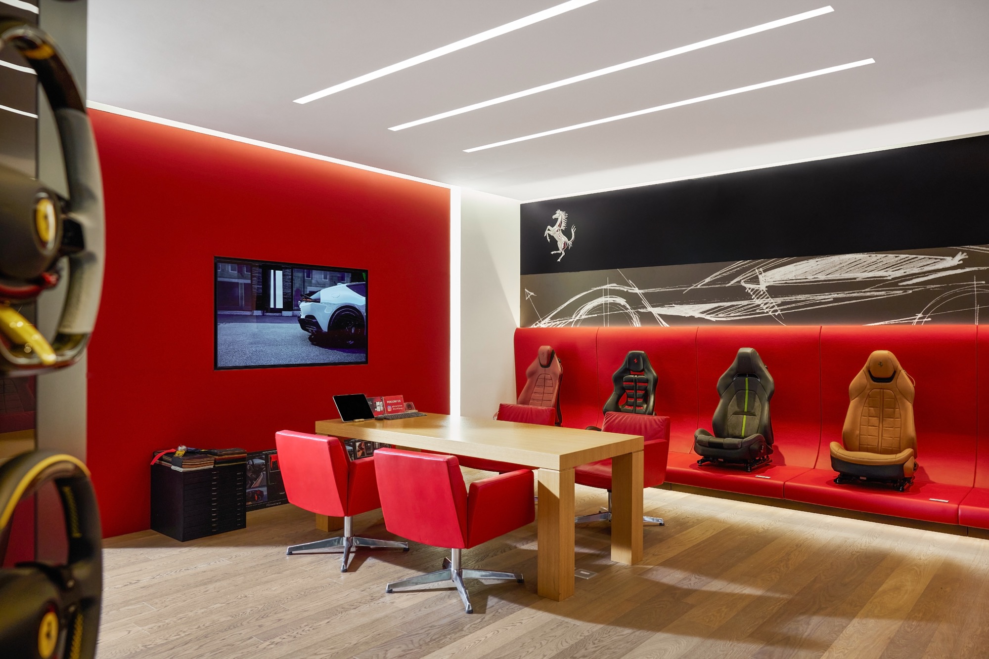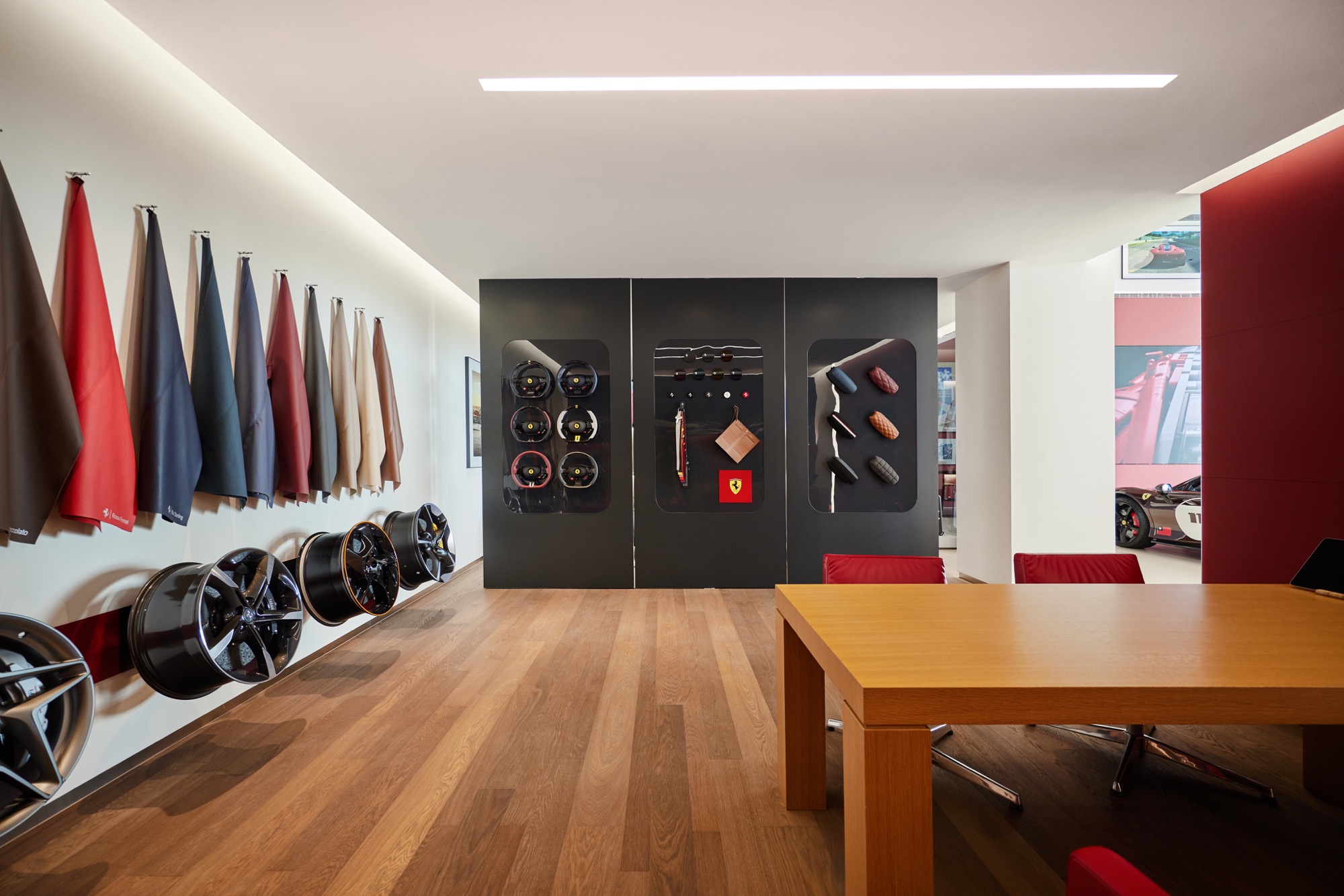 2F – Lounge。二樓設有濃厚品牌元素充斥的獨特空間,其中的Poltrona Frau頂級皮革傢俱也都來自Ferrari的故鄉義大利 ; 歷代的傳奇F1模型車陳列一字排開,及F1賽車前鼻翼與底板點綴,壯觀地呈現Ferrari 純粹的賽車靈魂,締造超越75年的璀璨篇章,更於各大賽車運動中創下無可匹敵的輝煌成就。