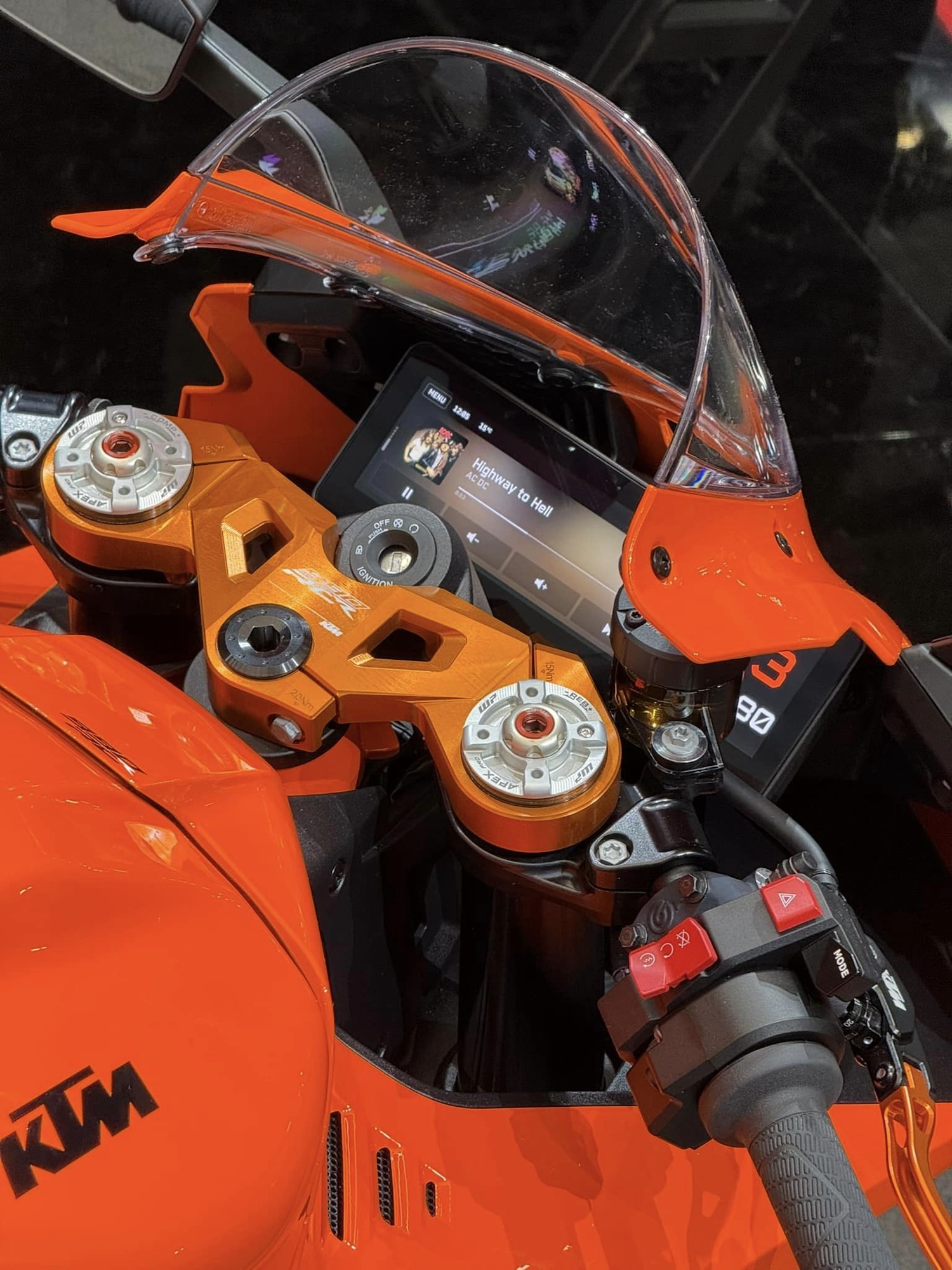 作為一台專為賽道設計的重機,KTM 下足了功夫,將 990 RC R 打造成一台「週日可以上賽道,週一還能日常騎」的車款。這款車配備了全可調的 WP Apex 倒立式前叉、可調腳踏、鑄鋁輪框包覆著 Michelin Power Cup 輪胎,並搭載了 Brembo 剎車系統和 MCS 主缸。這些高級配備讓人看了心癢難耐。