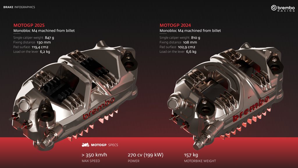 眾多車手初次駕駛 MotoGP 賽車時,往往會讚嘆這些車的制動效果,除了碳陶瓷剎車碟的功勞,Brembo 的制動系統也功不可沒。目前,所有車隊都使用自 2020 年就開始配置的 Brembo GP4 卡鉗,但新款設計有望提供更卓越的性能。