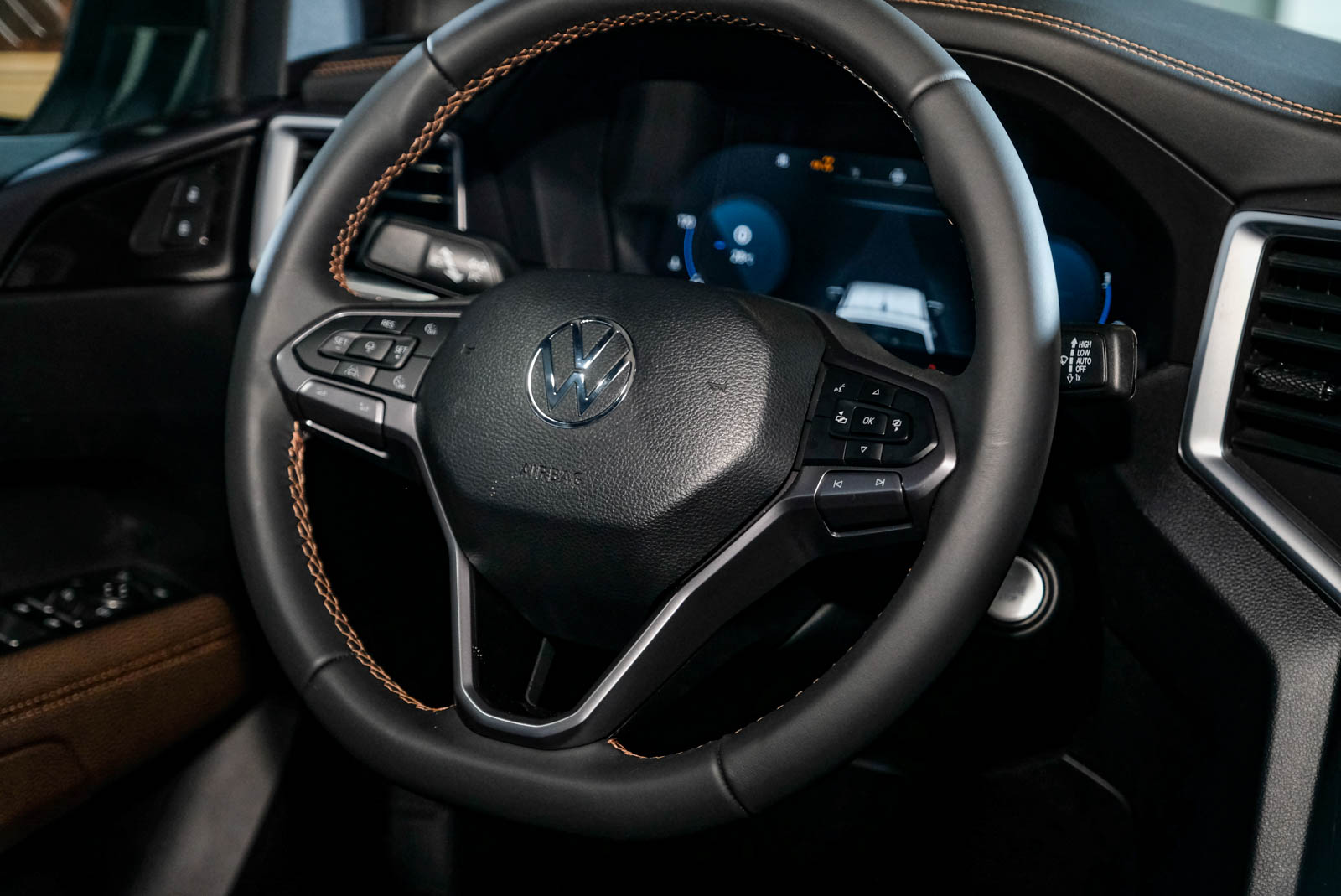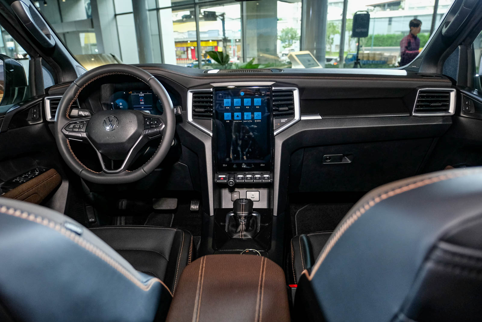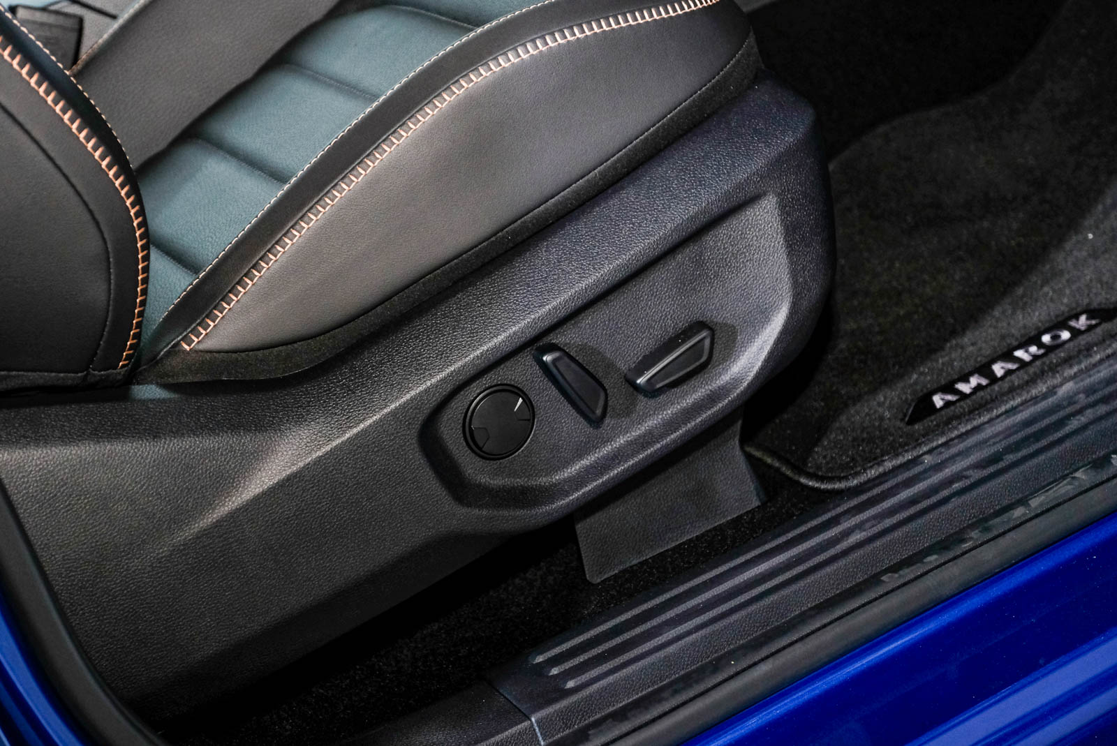 The All New Amarok 以豪華質感顛覆傳統之姿,打造全面進化的德智科技豪華運動皮卡車內座艙。有別於傳統越野皮卡單調座艙配色,其座艙內部採用高質感的黑 / 褐雙色內裝搭配黑色頂篷,營造出沈穩優雅且散發精緻奢華的車室氛圍,充分展現科技豪華運動皮卡的高階車格定位。座艙內飾方面透過大量以縫線皮革、鍍鉻飾板、蜂巢紋飾板等材質加以混搭運用,鋪陳出媲美豪華 SUV 般的內裝質感。