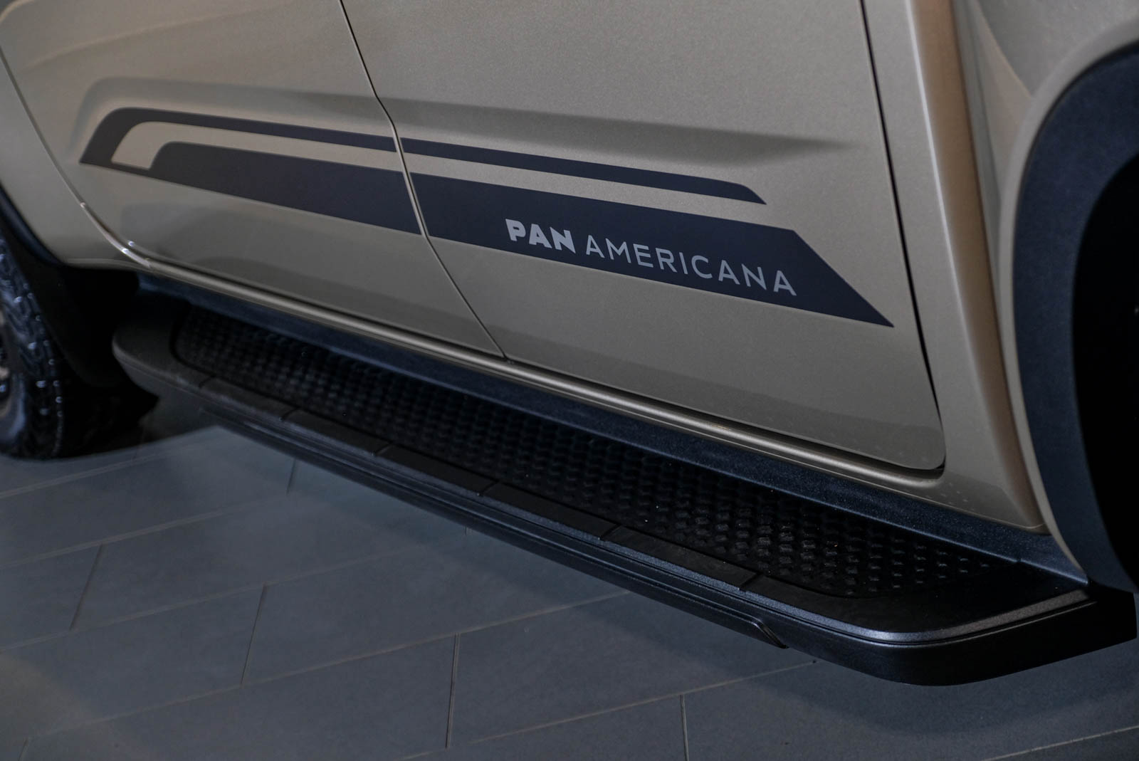 左右門板上的大型「PAN AMERICANA」黑色車貼則象徵其獨有的越野性能 DNA。此外,前後葉子板採用視覺上十分剛硬壯碩的立體外擴大型輪拱設計,向外隆起的線條搭配黑色護板,營造出肌理賁張的運動感。